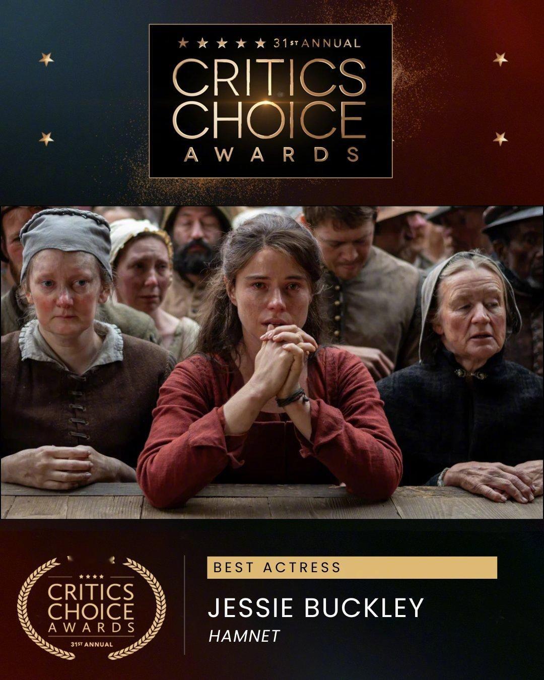 本届评论家选择奖获奖名单揭晓,《一战再战》拿下最佳影片、最佳导演和最佳改编剧本,提莫西·查拉梅凭借《至尊马蒂》获得最佳男主,杰西·巴克利凭《哈姆奈特》获得最佳女主:【电影类】最佳影片 :《一战再战》最佳男主角:提莫西·查拉梅《至尊马蒂》最佳女主角:杰西·巴克利《哈姆奈特》最佳男配角:雅各布·艾洛蒂《弗兰肯斯坦》最佳女配角:埃米·马迪根《武器》最佳年轻演员:迈尔斯·凯顿《罪人》最佳导演:保罗·托马斯·安德森《一战再战》最佳原创剧本:《罪人》最佳改编剧本:《一战再战》最佳外语片:《密探》最佳动画片:《K-POP:猎魔女团》最佳喜剧片:《白头神探:智斗灭世狂人》最佳选角及群戏:《罪人》最佳摄影:《火车梦》最佳艺术指导:《弗兰肯斯坦》最佳剪辑:《F1》最佳服装设计:《弗兰肯斯坦》最佳妆发设计:《弗兰肯斯坦》最佳视觉效果:《阿凡达3》最佳特技设计:《碟中谍8》最佳配乐:《罪人》最佳歌曲:Golden – 《K-POP:猎魔女团》最佳音效:《F1》【剧集类】最佳剧情剧集:《匹兹堡医护前线》剧情最佳男主角:诺亚·怀尔《匹兹堡医护前线》剧情最佳女主角:蕾亚·塞洪《同乐者》剧情最佳男配角:特拉梅尔·提尔曼《人生切割术》剧情最佳女配角:凯瑟琳·拉纳萨《匹兹堡医护前线》最佳喜剧剧集:《片厂风云》喜剧最佳男主角:塞斯·罗根《片厂风云》喜剧最佳女主角:珍·斯马特《绝望写手》喜剧最佳男配角:伊克·巴里霍尔兹《片厂风云》喜剧最佳女配角:贾内尔·詹姆斯《小学风云》最佳限定剧:《混沌少年时》最佳电视电影:《BJ单身日记4》限定剧/电视电影最佳男主角:斯蒂芬·格拉汉姆《混沌少年时》限定剧/电视电影最佳女主角:莎拉·斯努克《都是她的错》限定剧/电视电影最佳男配角:欧文·库珀《混沌少年时》限定剧/电视电影最佳女配角:艾琳·多尔蒂《混沌少年时》最佳外语剧集:《鱿鱼游戏》最佳动画剧集:《南方公园》最佳脱口秀:《吉米·坎摩尔直播秀》最佳综艺节目:《约翰·奥利弗上周今夜秀》最佳喜剧特别节目:《周六夜现场五十周年特别篇》跨年电影愿