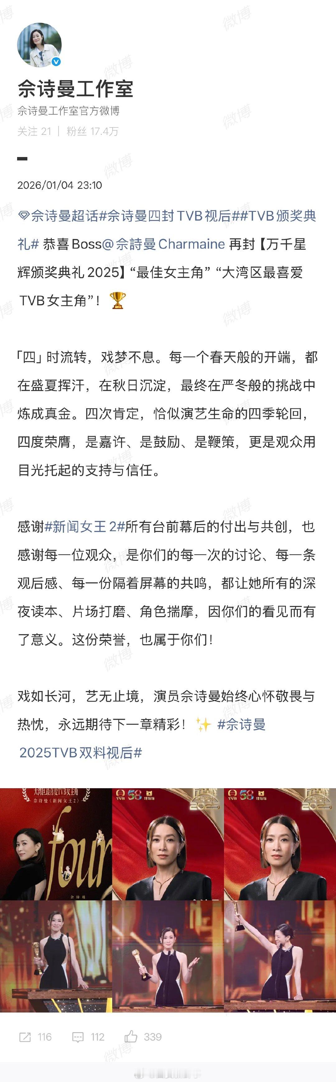 【工作室恭喜佘诗曼四封TVB视后】工作室回应佘诗曼四封TVB视后1月4日,2025TVB万千星辉颁奖典礼,凭《新闻女王》四封TVB视后。随后,其工作室发文:恭喜Boss再封“最佳女主角”“大湾区最喜爱TVB女主角”!「四」时流转,戏梦不息。每一个春天般的开端,都在盛夏挥汗,在秋日沉淀,最终在严冬般的挑战中炼成真金。四次肯定,恰似演艺生命的四季轮回,四度荣膺,是嘉许、是鼓励、是鞭策,更是观众用目光托起的支持与信任。感谢《新闻女王2》所有台前幕后的付出与共创,也感谢每一位观众,是你们的每一次的讨论、每一条观后感、每一份隔着屏幕的共鸣,都让她所有的深夜读本、片场打磨、角色揣摩,因你们的看见而有了意义。这份荣誉,也属于你们!戏如长河,艺无止境,演员佘诗曼始终心怀敬畏与热忱,永远期待下一章精彩!佘诗曼四封TVB视后