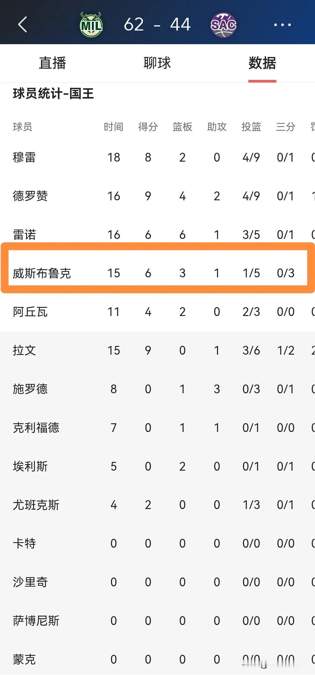 我真是受够国王老将威斯布鲁克的低迷和糟糕了!在今天国王主场迎战雄鹿的比赛中,目前双方半场战罢,国王以44:62落后对手18分。在前两节比赛中,威少首发出战15分钟,投篮5中1,其中三分球3中0、罚球6中4得到6分,还有2次失误,他的场上正负值为-13。 老实说,我真的对威斯布鲁克彻底的无语了,他一次又一次的打出这样糟糕的表现,有时候我真的非常希望威少立刻退役。
