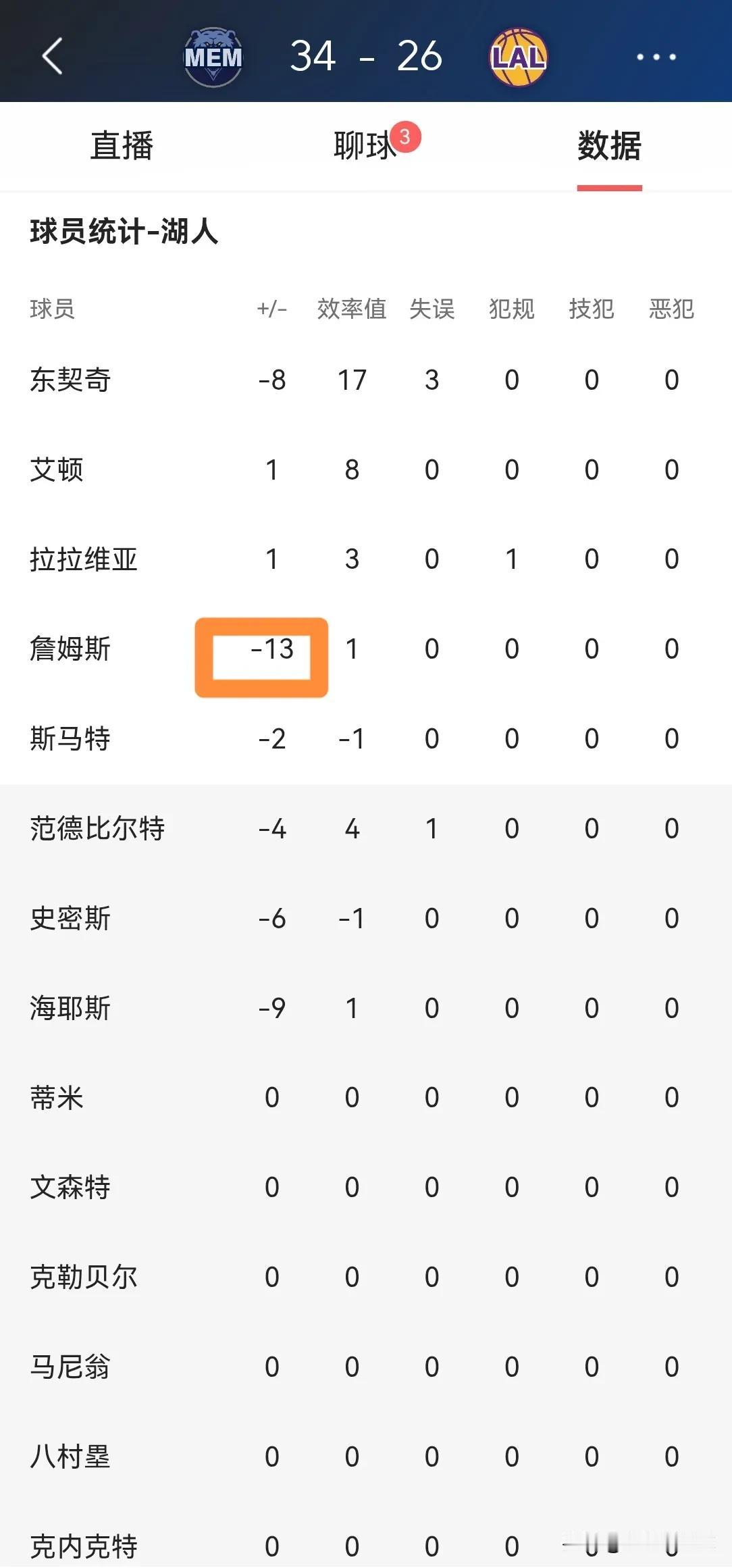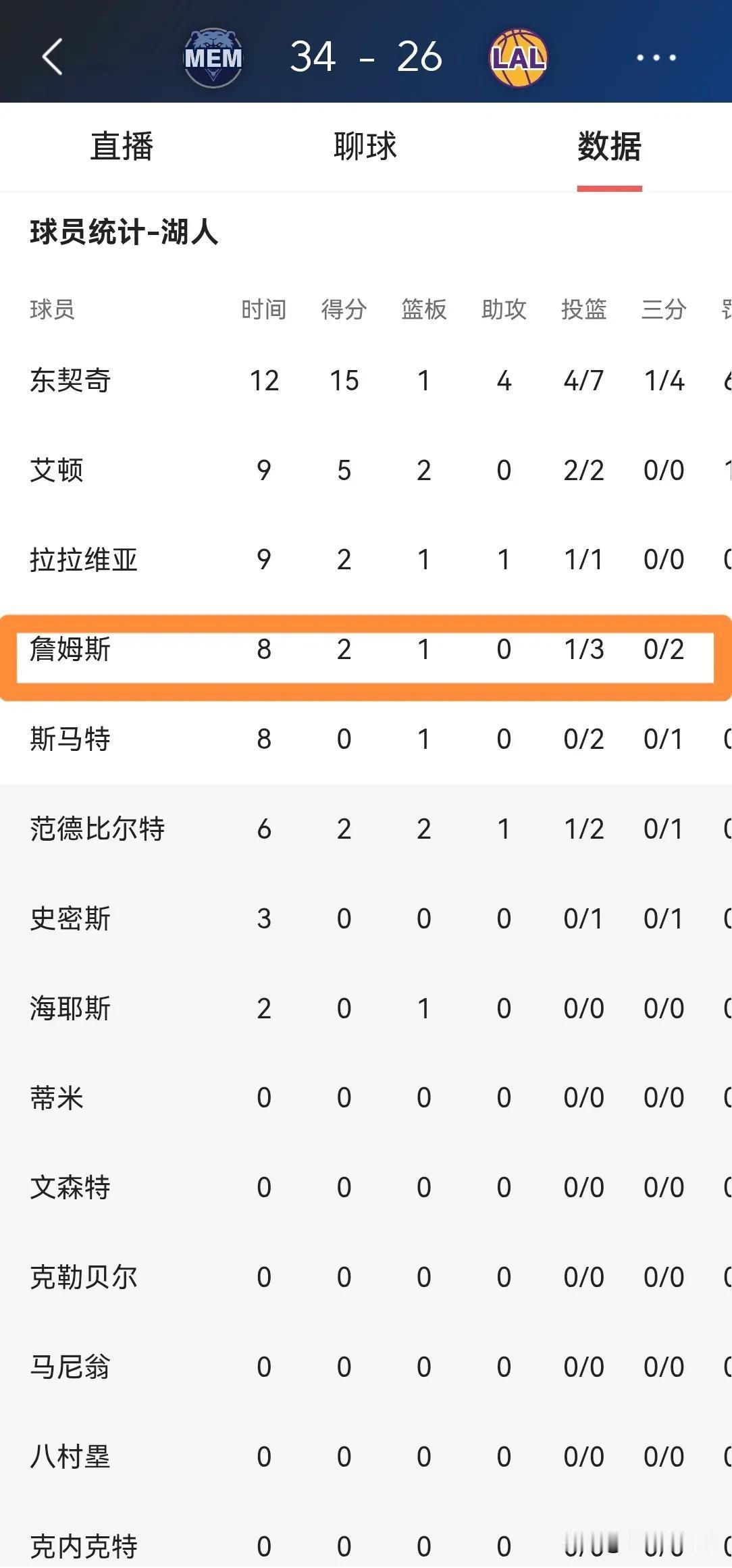 湖人超级巨星詹姆斯真是一个大笑话!在今天湖人主场迎战灰熊的比赛中,目前双方的第一节比赛已经结束,湖人以26:34落后于对手。在第一节比赛中,詹姆斯首发出战8分钟,投篮3中1,其中三分球2中0仅仅得到可怜的2分,他的场上正负值为球队最低的-13。 作为一名年薪高达五千多万美元的超级巨星,詹姆斯竟然打得如此糟糕,试问詹姆斯对得起湖人和湖人球迷吗?