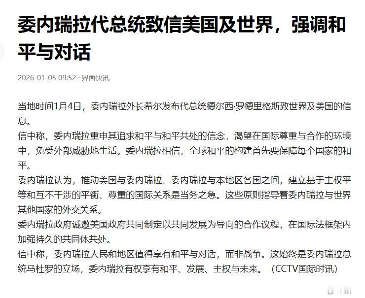 委内瑞拉这波迷惑操作给我看懵了! 昨天还在坚称绝不妥协,今天马上诚邀美国共同发展? 当地时间1月4日,委内瑞拉外长希尔发布代总统德尔西·罗德里格斯致世界及美国的信息。 在信中称,委内瑞拉重申其追求和平与和平共处的信念,渴望在国际尊重与合作的环境中,免受外部威胁地生活,更是“诚邀美国政府共同制定以共同发展为导向的合作议程”。 这看起来从“绝不妥协”到“诚邀合作”的急速转变,您可能会想是不是投降认怂了?但咱得看看代总统罗德里格斯是在什么情况下发出这封邀请的。那可不是在谈判桌上,而是在美国的军事行动已经取得“阶段性成功”之后——马杜罗总统已被控制。 与此同时,美国总统特朗普的言论更是毫不遮掩,他公开宣称委内瑞拉是一个“死掉的国家”,美国将“管理”委内瑞拉直至实施“安全”过渡,甚至还对代总统罗德里格斯发出威胁,称若她“不正确行事”,将付出比马杜罗“更沉重的代价”。 所以,这封“诚邀合作”的信,可能是“缓兵之计”。它的核心目的,是在枪口下为国家争取宝贵的喘息时间,避免局势立刻滑向最坏的全面战争或彻底崩溃。 那么,为什么是“共同发展”和“合作议程”呢?这就不得不提到委内瑞拉的命根子,也是美国此次行动最赤裸的目标——石油。委内瑞拉拥有全球最大的已探明石油储量,这块巨大的蛋糕,美国觊觎已久。 特朗普政府明确将获取委内瑞拉石油等资源作为核心目标之一。因此,委内瑞拉提出的“共同发展”,看似是伸出橄榄枝,实则是一招“以守为攻”。其潜台词是:你们想要我们的资源,可以,但不能用抢的。我们能不能坐下来,谈一个在“国际法框架内”、看似对双方都有利的合作方案?这样一来,既避免了资源被完全无偿掠夺,也为未来可能的谈判留下了一丝缝隙。 当然,也有可能是直接“认怂”了,因为军事上,面对美军压倒性的优势(例如此前已在加勒比海集结包括航母、核潜艇、F-35战机在内的强大军力),避战是避免更大灾难的理性选择。 经济上,石油出口命脉被美国制裁死死掐住,原油日产量已从巅峰时期的300万桶大幅下滑,民生压力巨大。更重要的是,在关键时刻,传统盟友的实质性支持可能远水难解近渴。在这种“孤掌难鸣”的绝境下,除了妥协,似乎已无路可走。不知道各位是怎么看呢?