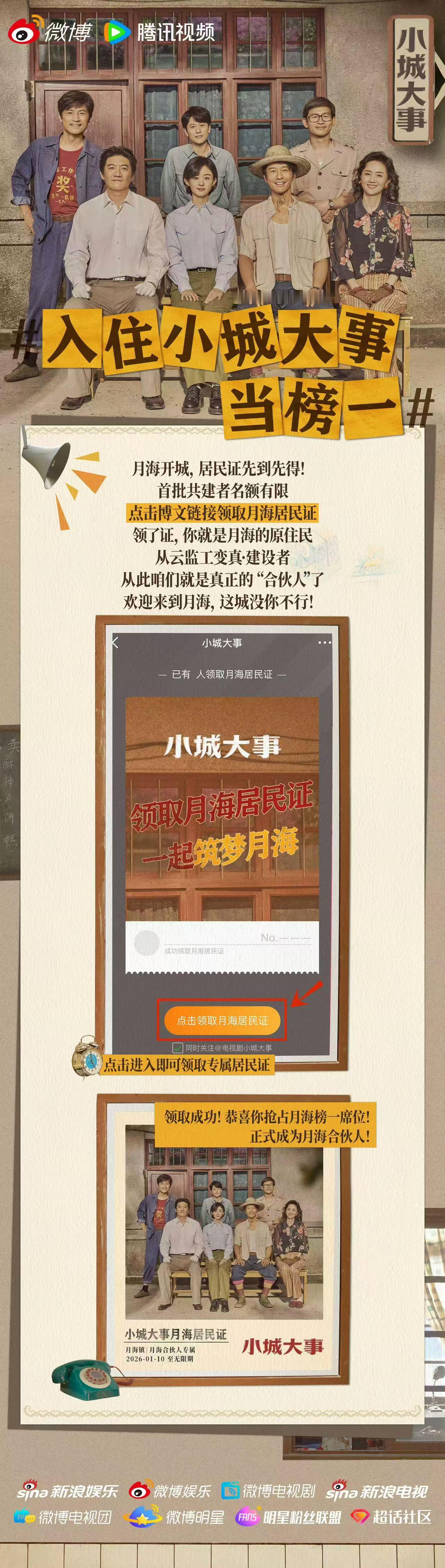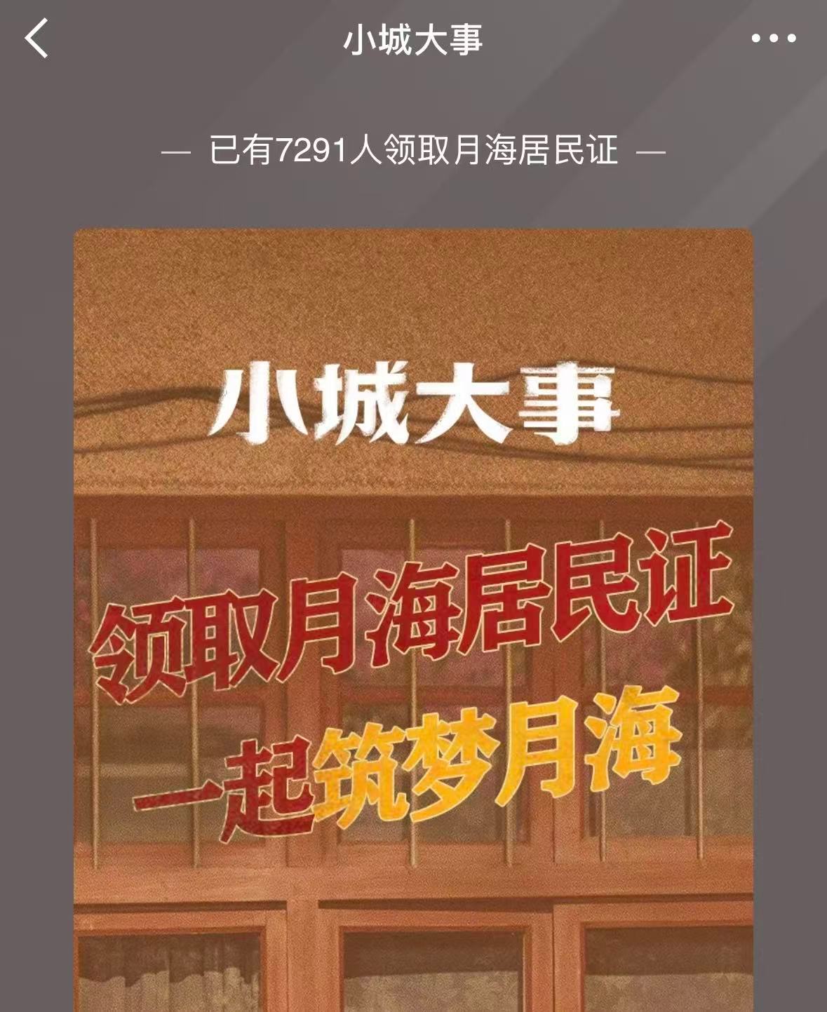入住小城大事当榜一小城大事一座城一群人 速来月海落户!官微贴心发放小城大事 专属居民证~点击链接定制你的月海户口本,一键生成80年代复古风证件照!从此你也是月海建设的见证者,追剧打卡都更有仪式感了~我已经把居民证设成屏保,坐等0110正式入住月海城!