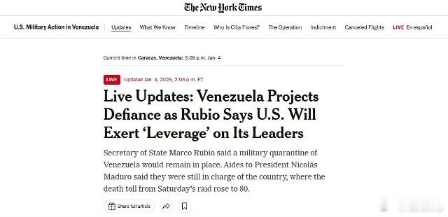 美国入侵委内瑞拉后死亡人数升至80人,《纽约时报》援引一名委内瑞拉高级官员的话报道。美国对委内瑞拉行动已致80人死亡马杜罗大部分安保人员死于美军侵略