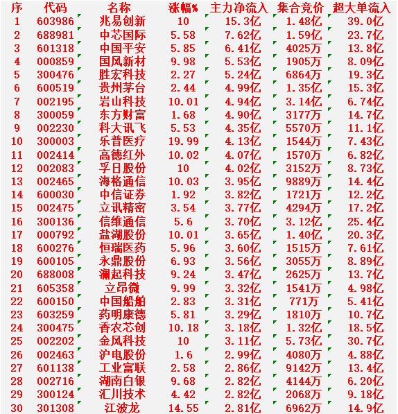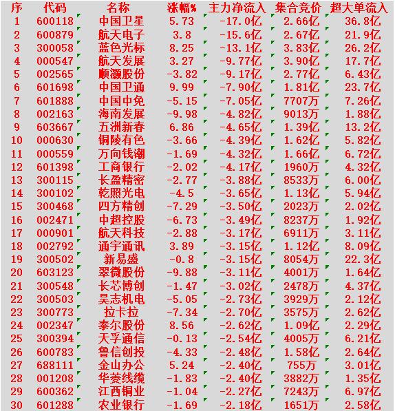 1月5日上午盘,主力趁低位,大幅买入的30名单: 兆易创新:涨幅10.00%,净流入15.3亿元; 中芯国际:涨幅5.58%,净流入7.62亿元; 中国平安:涨幅5.85%,净流入6.41亿元; 国风新材:涨幅9.98%,净流入5.53亿元; 胜宏科技:涨幅2.27%,净流入5.24亿元。 1月5日中午收盘,主力资金“大幅卖出”的30名单: 中国卫星:涨幅5.73%,净流出17.0亿元; 航天电子:涨幅3.80%,净流出15.6亿元; 蓝色光标:涨幅8.25%,净流出13.1亿元; 航天发展:涨幅3.27%,净流出9.77亿元; 顺灏股份:下跌3.82%,净流出9.17亿元。