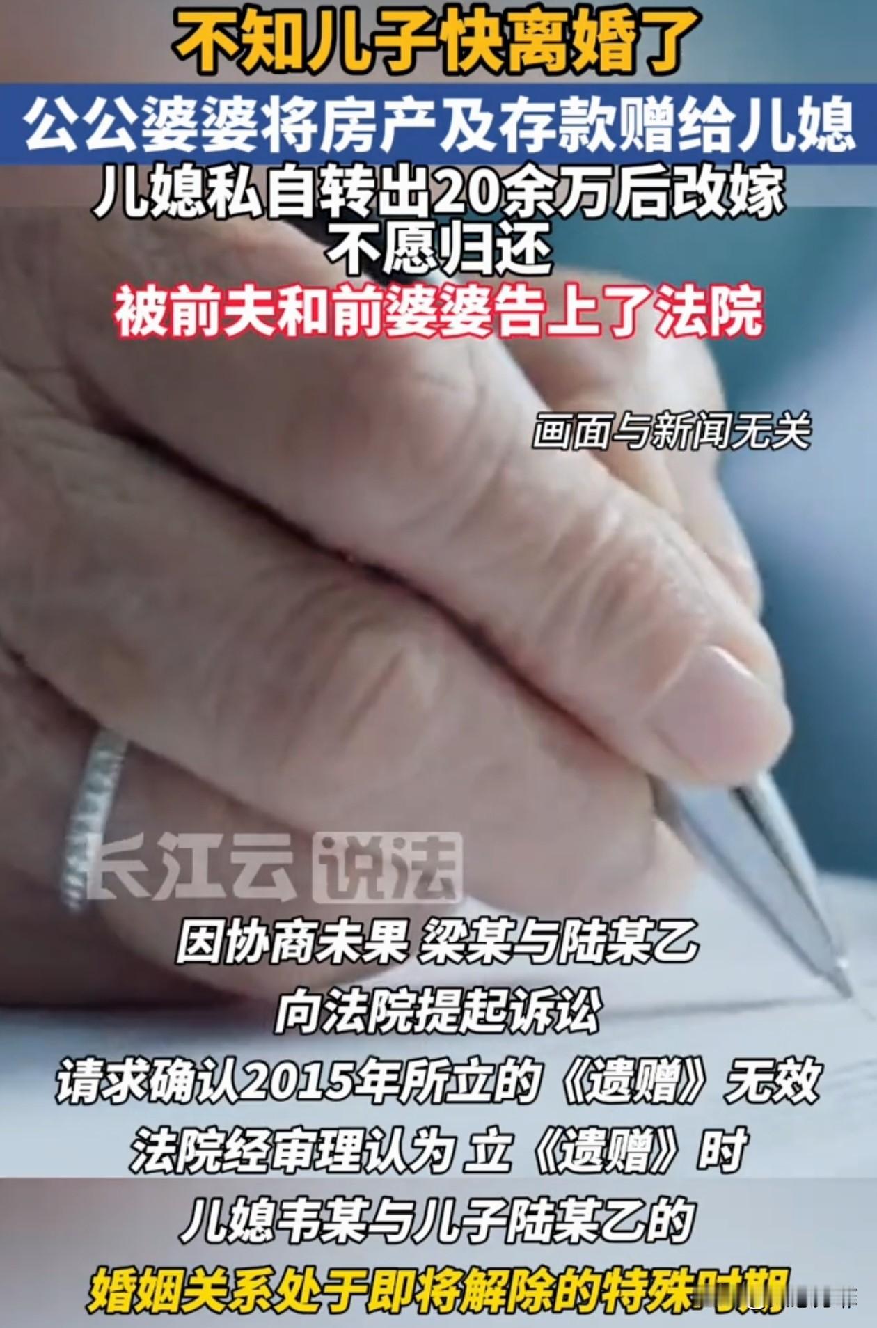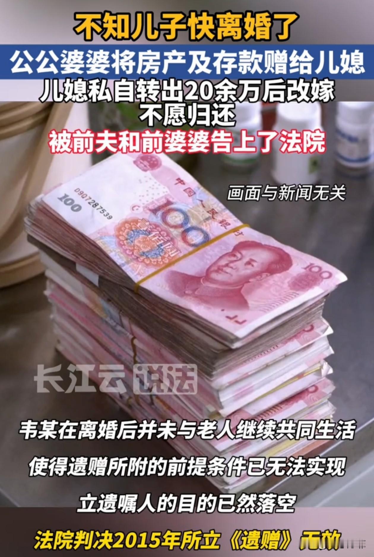 广西,两位老人不知道儿子快离婚了,把20万元赠给了儿媳妇,本希望她能照顾好家庭,结果她拿到财产后,没多久就改嫁了,老两口知道真相后,气愤不已,把她告上了法院。 2015年8月,老两口发现儿子和儿媳的感情好像有点僵,心里着急,就计划把家里的财产留给儿媳,让她知道家里人是真心待她,希望她拿到财产后能维系家庭,好好过日子,并为他们老两口养老。 半个月后,陆爷爷手写了一份《遗赠》文书,明确写着,把名下的房产,还有银行存折里的存款,都赠与儿媳,还特意找了见证人在场,就怕手续不正规。 可老两口不知道的是,就在这份遗赠立下的前几天,法院已经给儿子和儿媳下了离婚一审判决书,而且双方都已经收到了,就差最后生效的程序。 遗赠刚签完没几天,儿媳就拿着相关手续,以代理人的身份,直接把存折里的20万元存款,全额转到了自己的账户里。 转完钱之后,儿媳立马从儿子家里搬了出去,没多久就改嫁了别人,彻底跟老两口一家人断了联系。之后的八年里,她别说履行养老送终的承诺了,就连一次都没来看过老两口。 老两口一直被蒙在鼓里,直到2023年,陆爷爷因病去世。梁奶奶在整理老伴遗物,筹备后事时,想动用存款支付医药费,才发现存折里的20万元没了。 经过多方打听和核实,梁奶奶才知道了真相。陆爷爷生前知道这事儿后,又气又急,可多次找她追讨,都被她拒绝了,最后带着这个遗憾走了。 2024年初,为了给老伴讨回公道,也为了要回自己的养老钱,梁奶奶和儿子把女子告上了法院。 法院审理认为,老两口写遗赠时,是基于女子还是儿媳的错误认识,加上女子隐瞒离婚事实,影响了老人的真实意愿,属于重大误解。 ​ 而且这份遗赠其实是附条件的赠与,条件就是女子留下照料家庭,养老送终,可她根本没履行,条件没达成,赠与就不算数。 ​ 最终判决2015年的《遗赠》无效,女子上诉后,二审法院也驳回了她的上诉,维持原判。