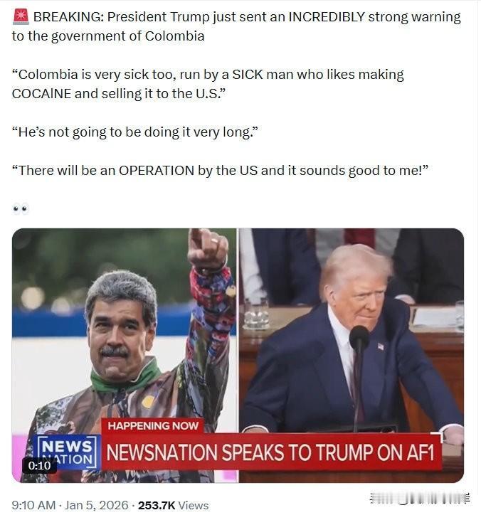 突发新闻:川普总统刚刚向哥伦比亚政府发出极其严厉的警告—— “哥伦比亚也病得不轻,被一个病态的家伙掌控着,他喜欢制造可卡因并卖到美国。” “他干不了多久了。 “美国将展开一次行动,我觉得这听起来不错!”
