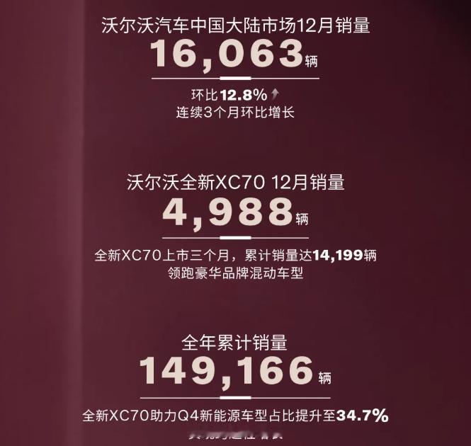 【沃尔沃汽车2025年国内销量超14.9万辆】日前,沃尔沃官宣:2025年累计销量超14.9万辆,表现出稳健的步伐。其中,12月中国大陆市场销量超1.6万辆,环比增长12.8%。面对中国市场新能源智能化浪潮,沃尔沃及时调整产品布局,凭借过硬的产品力实现跨越式增长。其中,全新XC70上市三个月,累计销量超1.4万辆,成功领跑豪华品牌混动车型。而作为沃尔沃品牌的经典车型,XC60在12月份实现销量4683辆,与全新XC70组成“双子星”车型,连续三个月稳居豪华中型-中大型SUV第一梯队。【来自懂车帝车友圈】