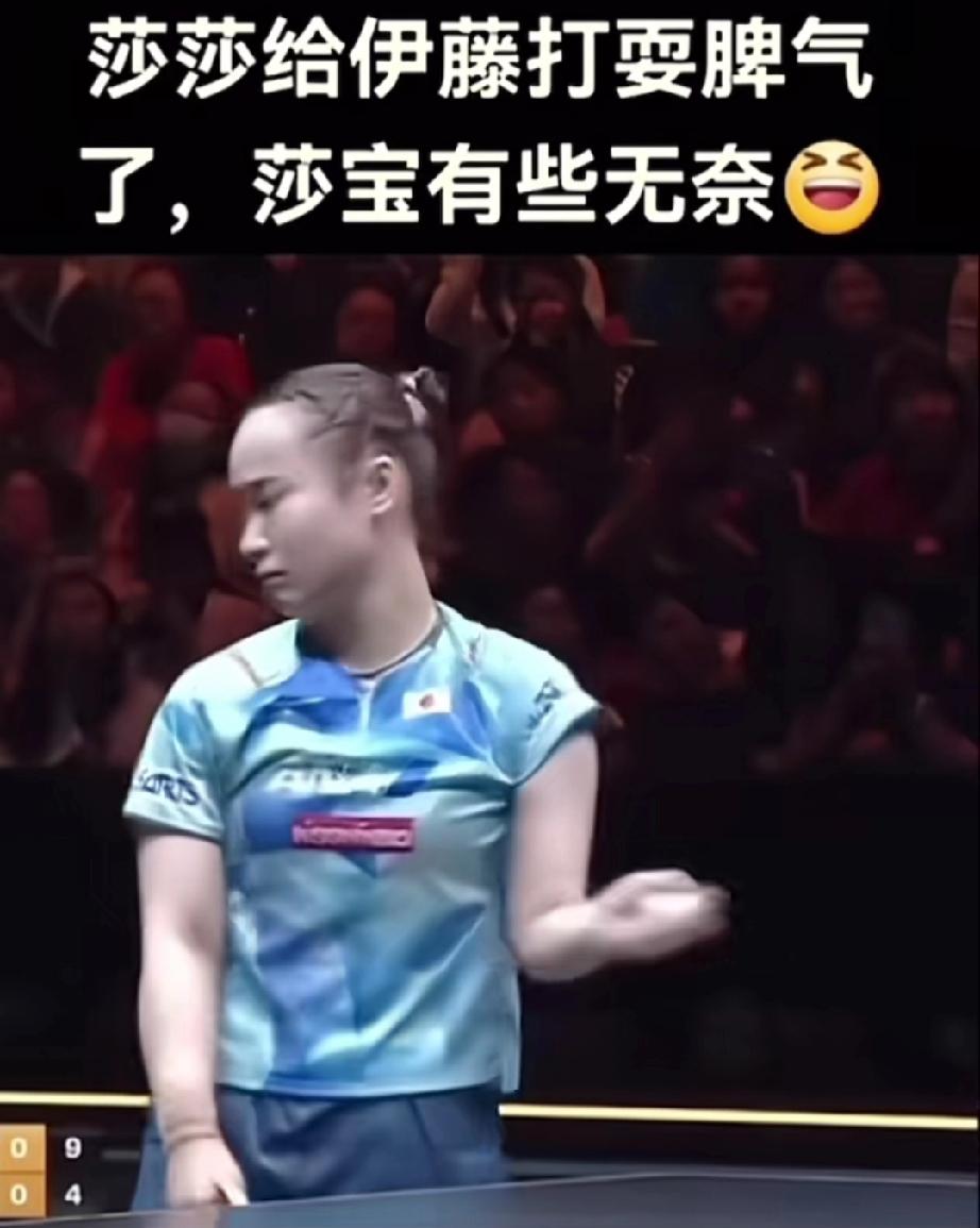 伊藤面对莎莎小脾气上来了! 拿着球一转头,想找妈妈了。 伊藤被莎莎全面压制,无论怎么做,发长球、短球、奇怪的球,莎莎总能以不变应万变。 最后看着莎莎,伊藤直接用手把球甩给对面。莎莎也懵了。 伊藤委屈巴巴:“伊藤说我白给你糯米团吃了,你还这么打我。” 莎莎:“伊藤,别闹,这是比赛,我让你俩球吧。” 莎莎:“来,发球,我保证不接住。” 我:“哈哈哈,莎莎你吃人嘴短了吧。”