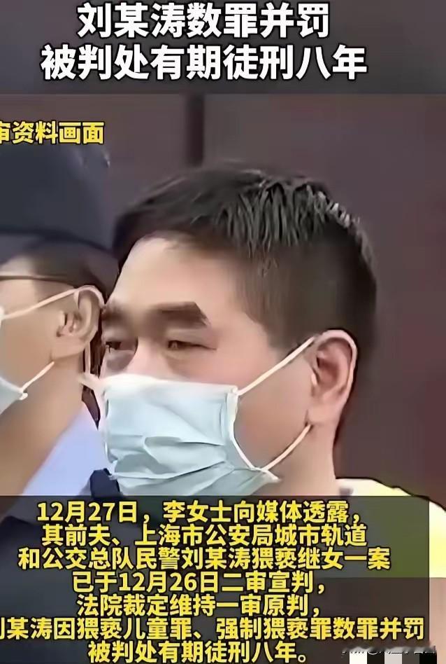 上海那位民警继父! ​​白天执法抓坏人,晚上回到家关起门就对未满14岁的继女屡次下手,还拿"杀了你们母女"威胁封口。 ​她在家里几乎不敢出声,夜里灯不关,书包里塞着小手电。 ​成绩直线下滑,人也越发沉默。 母亲起初想着忍,怕事情闹大,怕影响工作。 一身藏蓝警服,本该是守护平安的象征,是百姓眼里的定心丸。可这名上海民警,却把这身警服当成遮羞布,对至亲稚童伸出魔爪,这份反差的恶,让人彻骨心寒。 他的恶行从不是一时起意,从继女小学五年级就开始施暴,跨度整整十余年。一句死亡威胁,就把孩子锁进了暗无天日的恐惧,连安稳入眠都成了遥不可及的奢望。 孩童的世界本应阳光明媚,可这份无端的伤害,让孩子的学业彻底崩塌,性格变得极度沉默。童年的阴影,从来都不是时光能抹平的,这份恐惧和伤害,会跟着孩子一辈子,刻进骨头里。 母亲的隐忍,是太多受害家庭的无奈。怕家丑外扬,怕对方的身份报复,这份退让,换来的只是恶魔的得寸进尺。 母女俩终于鼓起勇气撕破了这层人皮,报警的那一刻,所有的屈辱和恐惧,都变成了钉死他罪行的铁证,他百口莫辩。 面对确凿的证据,这名民警还妄图全盘否认自己的所作所为,从头到尾毫无半分悔意。他以为能靠身份和威胁掩盖罪恶,却忘了法律的眼睛,永远雪亮。 正义或许会迟到,但绝不会缺席。该案一审宣判其有期徒刑八年,二审裁定维持原判,猥亵儿童罪与强制猥亵罪数罪并罚,这是法律给出的公正答案。 我国法律从不含糊,对未满14岁的孩子下手,必从重处罚!公职人员知法犯法,用身份当保护伞,只会罪加一等,没有任何侥幸可言。 他手里握着的是执法权,心里却没有半点法律敬畏,把权力当成威胁的筹码,把弱小当成欺凌的目标。穿警服的守护者,变成了藏在门后的恶魔,这是最不能容忍的罪恶。 他不配为人父,不配穿这身警服,更不配站在执法的岗位上,对毫无反抗能力的孩子下手,这份龌龊与恶毒,刻进了骨子里。 孩子的世界里,没有忍一步海阔天空,只有退一步得寸进尺。面对任何侵害,唯有勇敢站出来,让恶人伏法,才能护住孩子的平安和尊严。 所有的沉默和退让,都是对罪恶的纵容。保护未成年人的底线,容不得半点触碰,任何披着人皮的恶魔,终究逃不过法律的严惩和世人的唾弃。 各位读者你们怎么看?欢迎在评论区讨论。