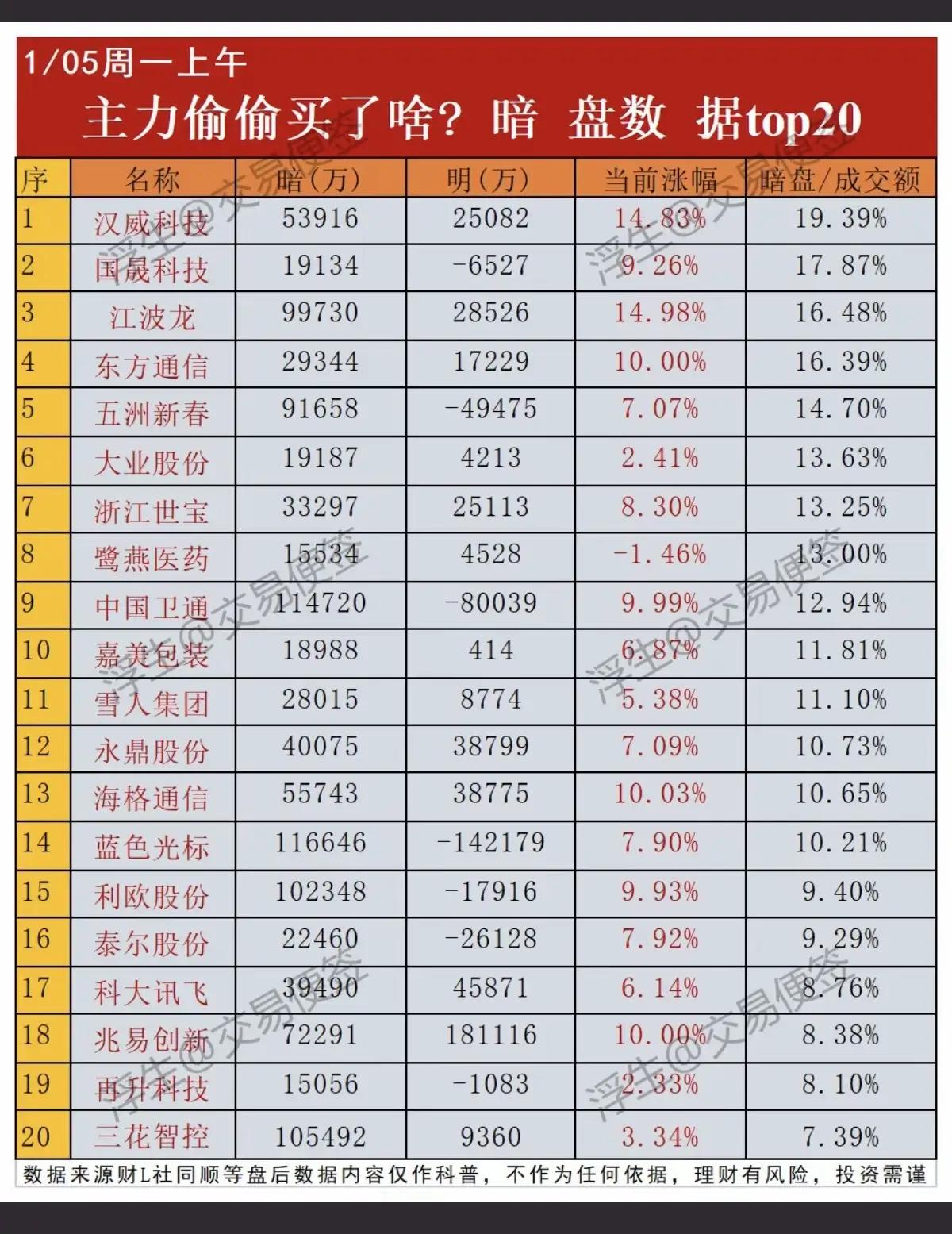 1月5日,周一午盘A股主力暗盘数据一览表!!! 汉威科技主力暗盘买入5.39亿,后市值得高看一眼;国晟科技主力暗盘资金买入1.9亿,后市值得期待;江波龙主力暗盘资金大幅抢筹9.97亿,后市值得重点关注;五洲新春主力暗盘资金大幅流入超9亿,后市值得高看!!!
