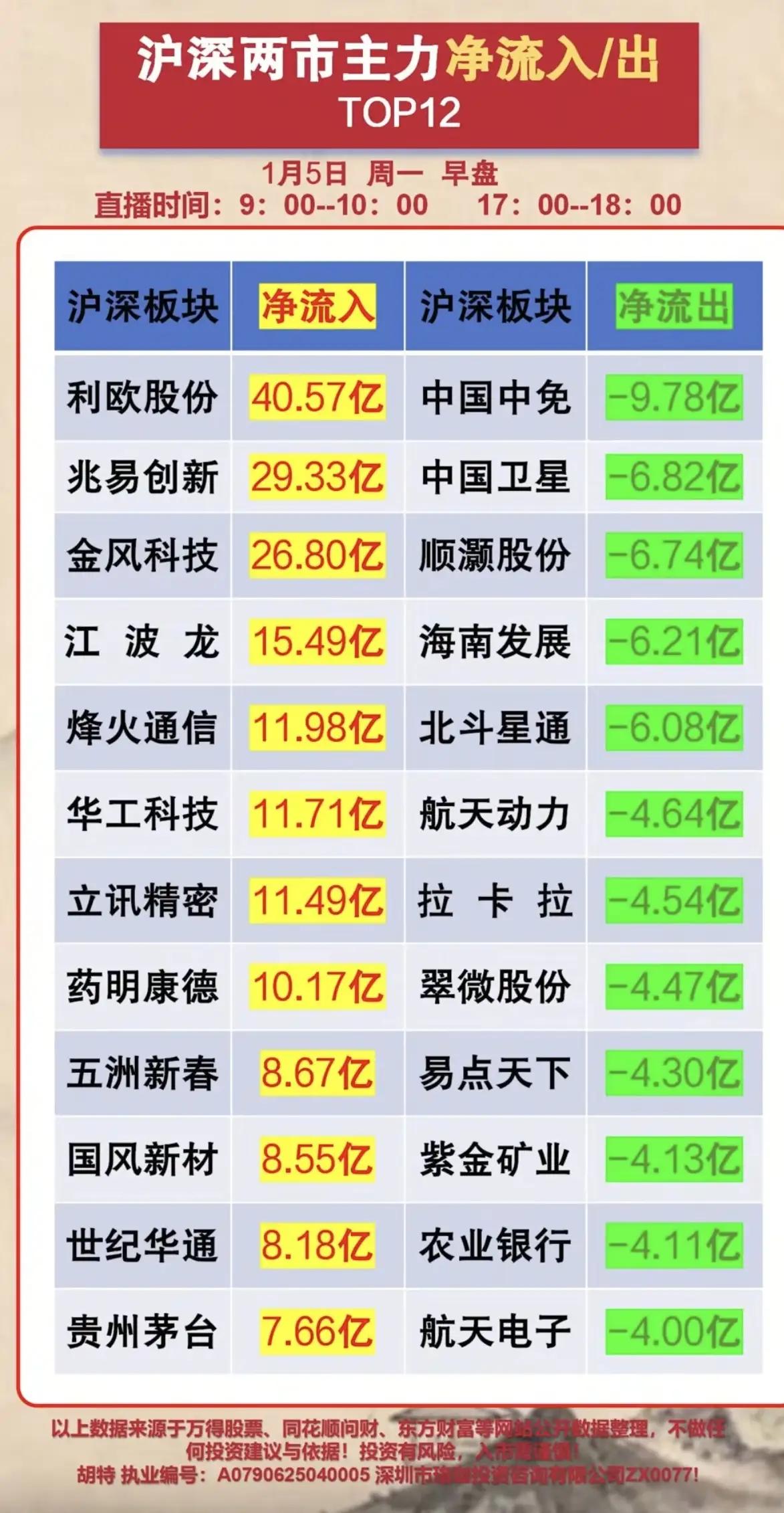 1月5日,周一A股主力早盘抢筹出逃表!!! 早盘,利欧股份主力净流入超40亿,后市值得高看一眼;兆易创新主力资金大幅抢筹29.33亿,后市值得期待;中国中免主力资金出逃超9.78亿,后市需小心谨慎;中国卫星主力资金大幅流出超6亿,后市需注意风险!!!