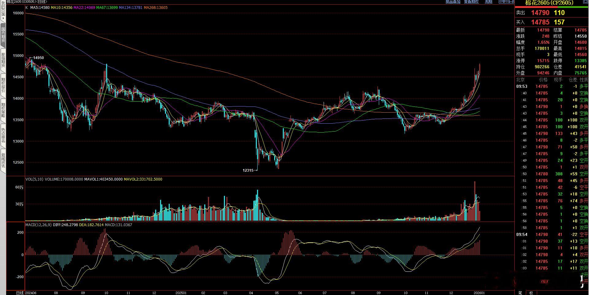 棉花 短期依旧强势 早盘冲击了14800一线压力。短期及时看空也不做空 仍然继续等回调多思路!