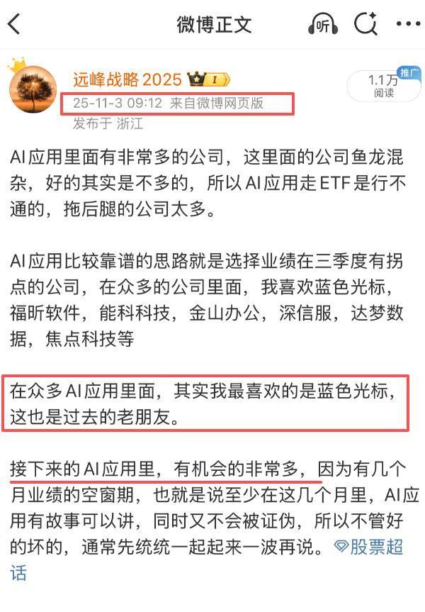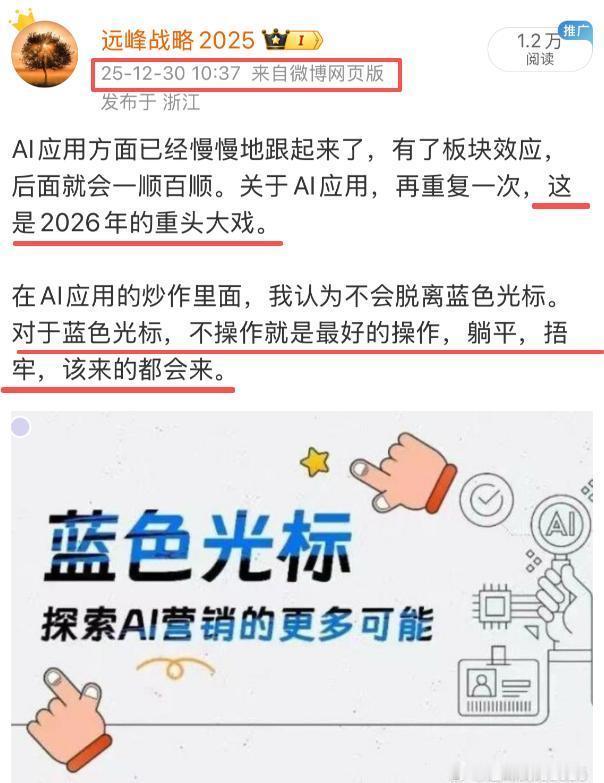前面我一直说2026年的AI应用会有所大成,由此挖出了潜在的公司--蓝色光标,但AI应用方面不应该仅仅停留在蓝色光标上,其实脑机接口、云游戏、AI软件、AI教育等等多方面,多维度去重视,2025是个硬件发展大年,2026顺藤摸瓜也应该轮到AI应用爆发。这个方向我认为会诞生一批令人赞叹的公司。 蓝色光标今天再度创下新高,长久以来对于这个公司寄托了很多期望。看着这娃推土机式地成长,还是值得欣慰的,。 再重申一遍:2026年我认为是AI应用的大年。