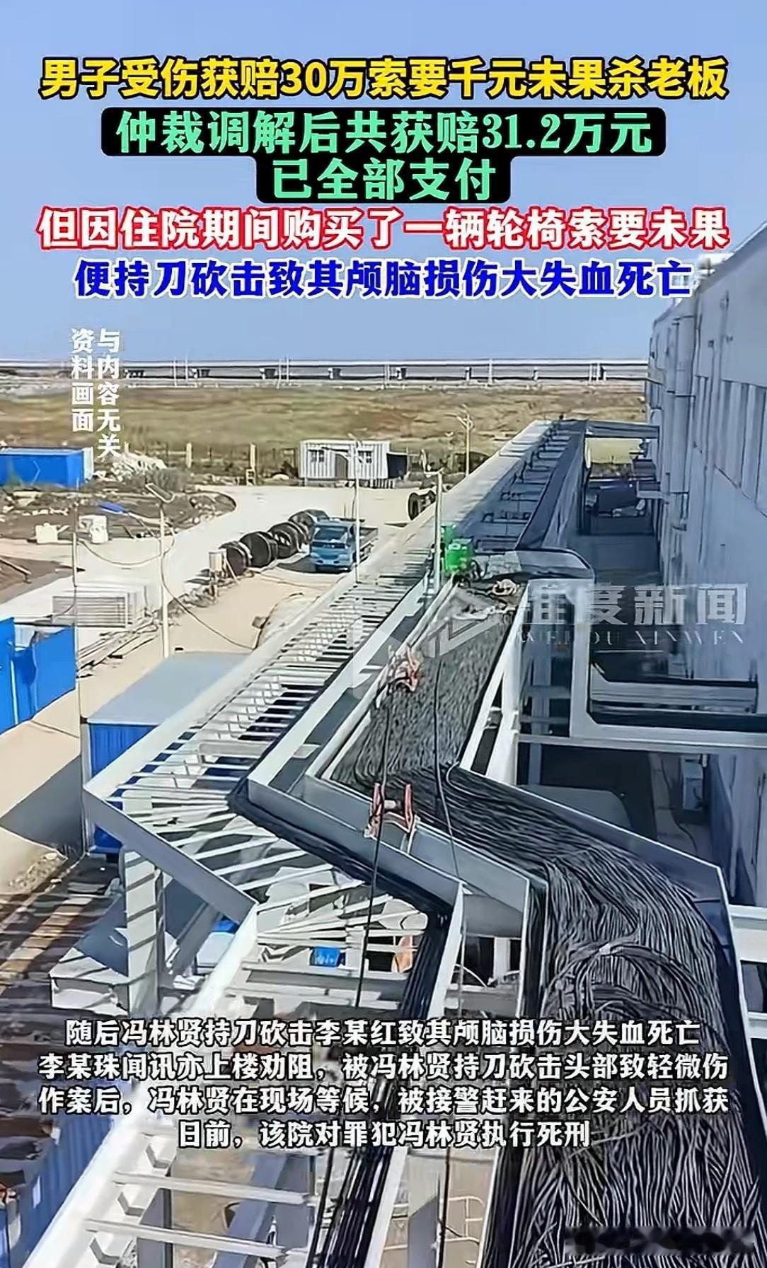 必须严惩不贷!江西上饶,男子在安装电缆时,不慎从高处摔下,造成右腿骨折。治疗期间的医药费花了20多万,由老板全部支付,但他使用的轮椅是自己家买的,花了599元。事后,男子和老板经仲裁后协议,由老板支付31.2万元此事了结,但男子又多次找老板索要买轮椅的钱,老板父亲给他500元,男子不接受,持刀将老板砍死,将老板父亲砍伤,男子在现场被警方抓获归案。 冯某是70后,平时住在村里,有时出去打个零工。 后来他一直跟随老板李某,做安装电缆的工作。 可就在2021年的9月,冯某在跟老板安装电缆时, 因操作不当,不慎从高处摔下来。 冯某顿时倒在地上动弹不得,老板和其他员工,赶紧将他送到医院急救。 经过诊断,冯某右腿骨折,幸好身体的其他部位并未受伤。 伤筋动骨100天,冯某住院期间,老板李某并未逃避责任。 他认为冯某受伤是在工作中,自己理应承担所有费用。 冯某在治疗腿伤期间,所花医药费共20多万元,老板李某全部支付了。 冯某腿伤因无法下地活动,他的妻子花了599元,买了一个轮椅给他使用。 在冯某的腿伤完全好了之后, 双方在2023年4月,达成仲裁调解协议。 由老板李某,支付冯某31.2万元,此事彻底了结。 双方在调解协议上签字画押。 老板以为,该花的钱也花了,冯某的伤也好了,双方以后再无瓜葛。 但是冯某拿到了赔偿款后,仍不断对李某纠缠, 主要的理由,他认为老板应该把轮椅钱再给他。 但李某认为,协议上已经写的清清楚楚,自己支付冯某30多万后,此事故已彻底了结。 冯某不应该再找他要钱,但冯某却耍起了无赖,就是缠着李某不放。 他经常给打电话,还多次找到李某家里索要轮椅钱。 李某并非在乎这1000块钱,而是他不想开这个头,他太了解这个冯某了。 如果这次给了他轮椅钱,下次说不定还会出什么幺蛾子。 既然已经经过了仲裁,也签订了协议,自己该拿的钱一分不少。 599元的轮椅费用已包括在内,不可能再给他一份钱。 冯某多次讨要后一直没拿到钱,便怀恨在心。 2024年5月25日上午11点多,冯某骑电动车再次来到老板李某家。 在李某家的一楼门口,冯某正好看到老板李某,他上前张口索要1000块钱,被李某当场拒绝。 此时李某74岁的父亲老李也在现场,他不想将事情闹大,就掏出500块钱给冯某,但冯某嫌钱少不接受。 李某和他的父亲,无论如何也没料到,冯某这次并不是单纯来要钱的,他是有备而来,准备来个彻底了断。 当时老陈给了他500块钱,他不接受,却一直追着李某进了他家的2楼。 冯某拿出早已准备好的刀砍向李某,导致李某颅脑损伤,大失血死亡。 李某的父亲听到楼上的动静后上楼劝阻,也被冯某用刀砍头部,致轻微伤。 冯某做完这些非常震定,他一直等在现场,随后被警方抓获。 这件事,据冯某受伤已经过去了将近3年的时间,又发生这样的悲剧实在令人唏嘘。 而事情仅仅因为1000块钱,却导致一死一伤。 而冯某也因故意杀人罪,被检方提起公诉,最终被执行死刑。 仅仅因为1000块钱,两条人命没了,还毁了两个家庭。 究其原因,无非是冯某贪得无厌。 工作中出了事故,不管是什么原因,老板也算仁义尽致。 后面又经仲裁,双方也协商好了,老板再次拿出30多万算是对事故的最终了结。 如果冯某不服,可以走法律途径,来解决问题。 冯某既然签了协议,就表示已经同意了赔偿方案,事后再找老板要钱,实属无赖。 老板父亲拿出500块钱想平息此事,但冯某仍行凶杀人,可谓凶残至极。 有人认为,老板在1000块钱上太过计较,如果老板当时拿出1000块钱,也许就保住了命。 但也有人认为,像冯某这种人,就算给了他1000块钱,他还会生出是非,所以老板才不肯答应。 根据《刑法》第232条:故意杀人的,处死刑、无期徒刑或者10年以上有期徒刑。 冯某因索要轮椅费未果,持刀将老板李某砍死,其行为属于故意非法剥夺他人生命。 犯罪情节极其恶劣,造成了一人死亡的严重后果,因此被判处死刑有法可依。 《最高院关于审理人身损害赔偿案件适用法律若干问题的解释》第13条:残疾辅助器具费按照普通适用器具的合理费用标准计算。 伤情有特殊需要的,可以参照辅助器具配制机构的意见确定相应的合理费用标准。 本案中,冯某因工伤购买轮椅,轮椅属于残疾辅助器具。 但双方已通过仲裁调解,达成赔偿协议,该事故已赔偿完毕,冯某已接收赔偿金额。 老板李某支付了31.2万元并约定此事了结。 从法律角度看,若协议中未明确排除轮椅费,一般会认为,该赔偿款已包含合理的残疾辅助器具费用,等各项相关损失。 所以,冯某事后再单独索要轮椅费,缺乏法律依据。 悲剧发生后,法院以故意杀人罪,判处冯某死刑。 2025年12月11日,冯某被执行死刑。 对此,你怎么看?