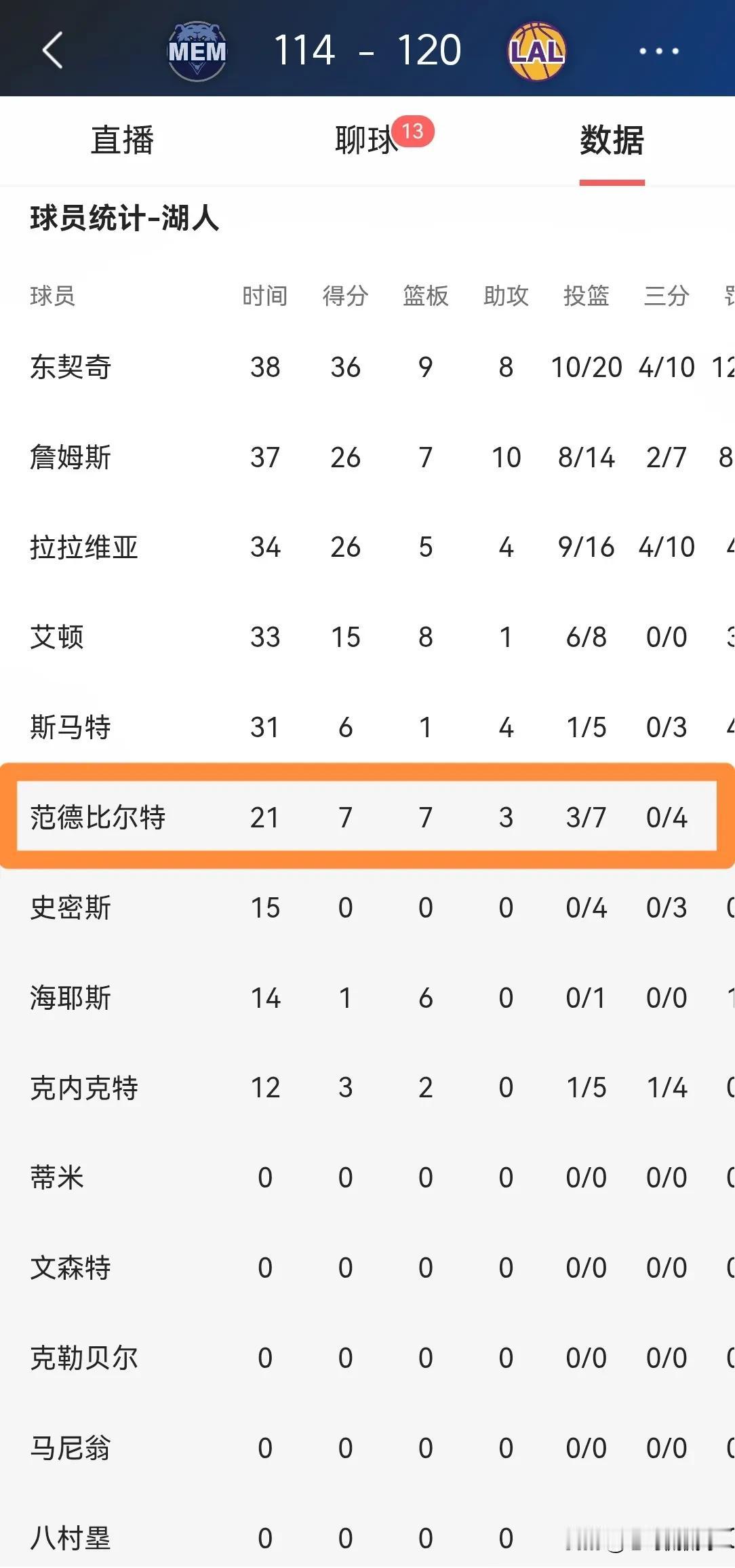 湖人大将范德比尔特的优缺点真是太明显了!在今天湖人主场以120:114战胜灰熊的比赛中,范德比尔特将自己能拼能抢却不擅长投射的优缺点展露无疑。 整场比赛下来,范德比尔特替补出战21分钟,投篮7中3,其中三分球4中0、罚球2中1得到7分7篮板3助攻1盖帽。 对于范德比尔特这样的球员来说,他基本上不会出现在球队的决胜时刻,因为他的投篮能力真是太差了,当球队的超级巨星遭遇包夹时,他无法命中空位投篮。