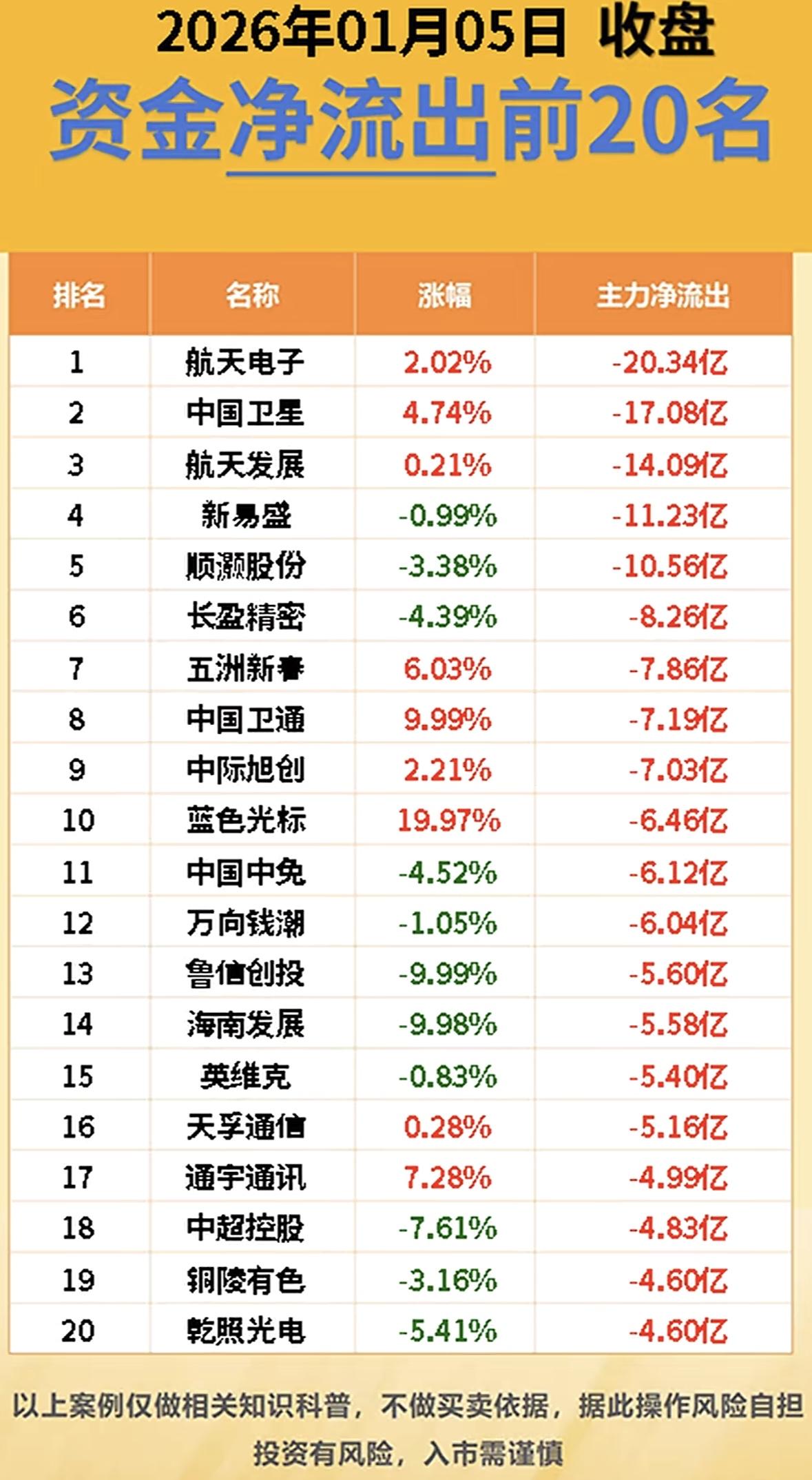 1月5日资金净流入前20名,胜宏科技领跑! 科技股领涨资金潮,茅台平安稳居前三,航天医疗爆发抢眼,投资需谨慎。