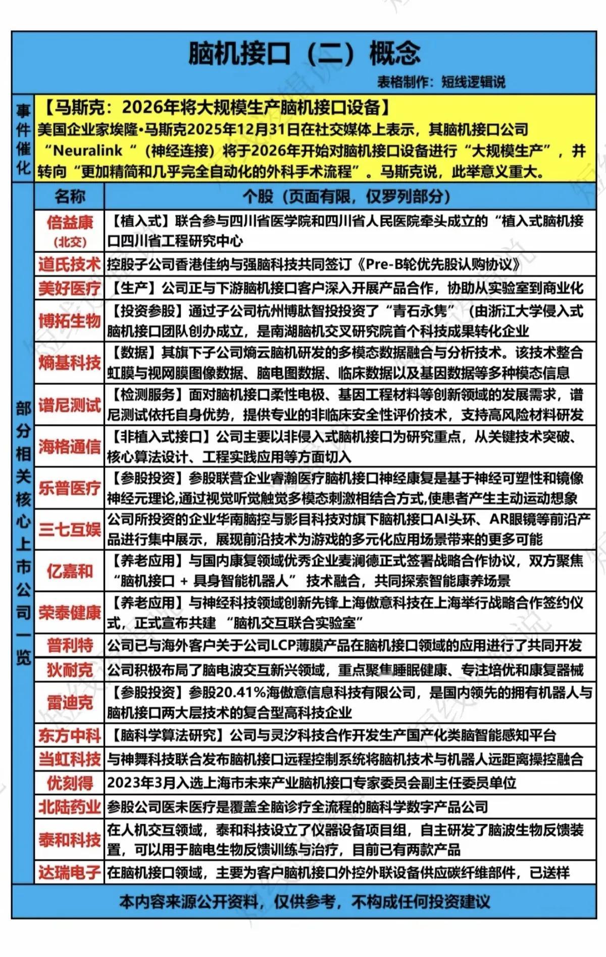 1月5日,周一A股这个板块有望延续强势!!! 马斯克表示,其脑机接口公司“Neuralink”将于2026年开始对脑机接口设备进行大规模生产,并转向“更加精简和几乎完全自动化的外科手术流程”,重点关注:乐普医疗、达瑞电子、优刻得,相关概念有望延续强势!!!