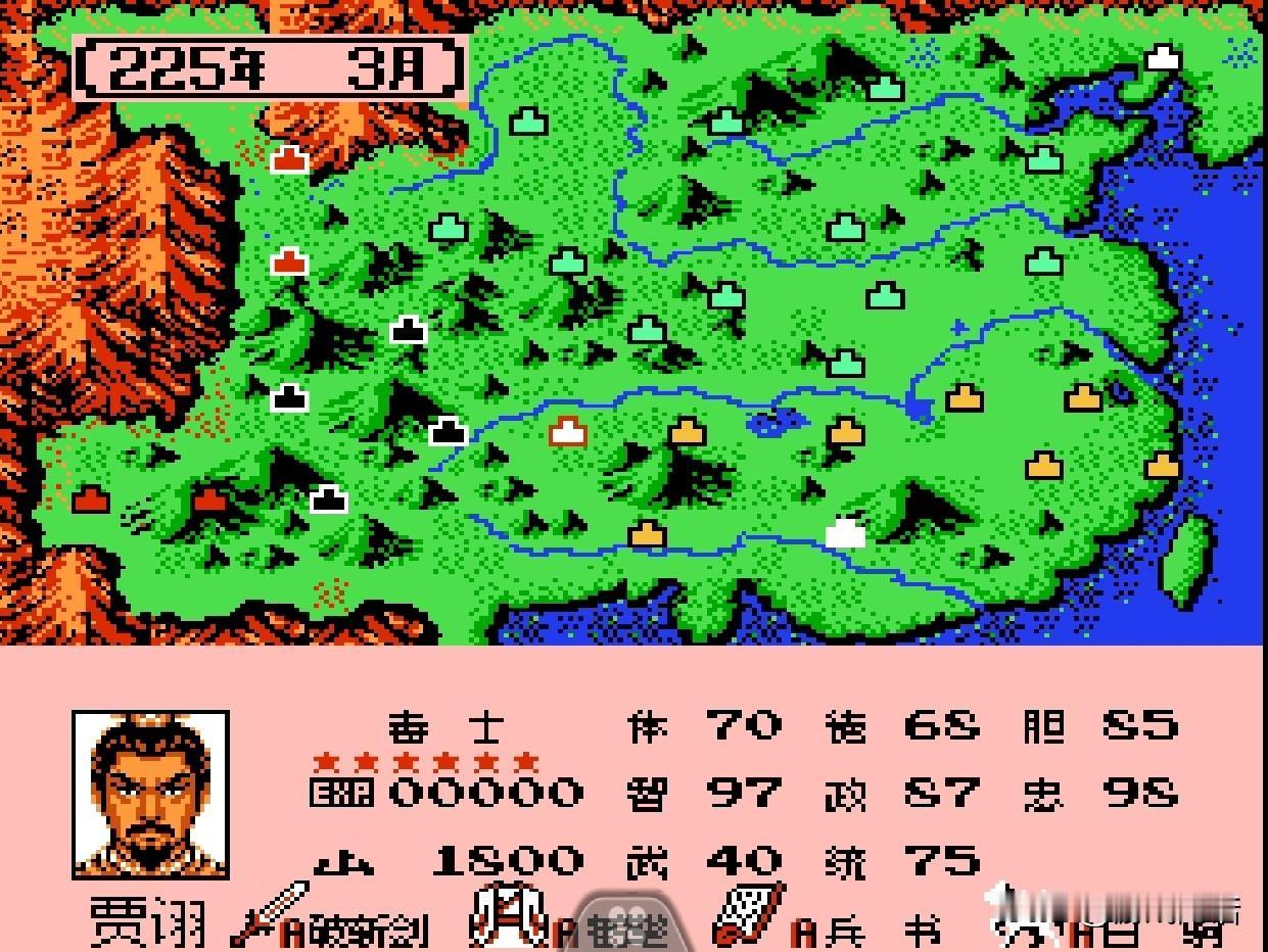 这四版的贾诩,哪一版最契合你心中“毒士”的形象呢? 图一源自《三国志1中原之霸者》,智97,德46。 图二出自《三国志2霸王的大陆》,智95,德65。 图三来自《英雄起源》,智95,德65,政85,统88,胆66。拥有特技“帷幕”,在战场上能让武将的特技失效。 图四来自一乐版《北伐中原》剧本,智97,德68,政87,统75,胆85。具备特技“毒士”,释放计策时机动力消耗减半,按民忠计算成功率,且有几率使敌将定止。 贾诩 霸王的大陆