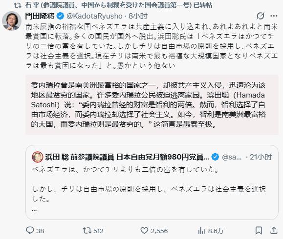 日本公知嘲笑委内瑞拉“穷是因为蠢”。1月5日,日本著名的右翼评论家门田隆将,转发了议员浜田聪的一条推文,在那指点江山激扬文字。他们拿着智利和委内瑞拉做对比,得出结论说:智利选了“自由市场”所以富得流油,委内瑞拉选了“社会主义”所以穷得掉渣,最后还轻蔑地加了一句评语——“这简直是愚蠢至极”。 乍一看,这套理论简直是无懈可击的“公知体”范文。摆数据、讲道理,一边是虽然有动荡但总体GDP光鲜的智利,一边是通货膨胀、超市空空的委内瑞拉。在很多人眼里,这不就是证明“跟美国走有肉吃,跟美国作对喝西北风”的铁证吗? 然而,实事求是讲,门田隆将这番话,不仅是坏,而且是典型的“把结果当原因”。他这套逻辑,就好比是一个强盗把路人的腿打断了,然后嘲笑这个路人:“你看,你跑得没旁边那个跪着的人快,肯定是因为你跑步姿势不对,真是愚蠢!” 问题在于,委内瑞拉之所以从“富得流油”变成“穷得掉渣”,真的是因为他们不会算账吗? 把时钟拨回去,当委内瑞拉试图把埋在地下的石油收益拿出来,给穷人盖房子、看病、发福利的时候,是谁冻结了他们的海外资产?是谁禁止他们卖油?又是谁不准他们进口药品和零件?是美国。美国为了维护美元霸权,绝不允许后院出现一个不受控制的能源大国。 反观智利,所谓的“南美优等生”,其繁荣的代价是什么?是铜矿资源的控制权长期掌握在欧美资本手里,是巨大的贫富差距,是底层民众在高物价中挣扎。说白了,智利的“自由”,是资本自由掠夺的自由;智利的“富裕”,是买办阶层帮着美国人数钱分到的那点残羹冷炙。 门田隆将之所以要在这个时候抛出这套“受害者有罪论”,根本不是为了讨论经济学,而是为了给自己壮胆,给日本洗地。 在日本右翼眼里,主权是不值钱的,生存才是硬道理。他们潜意识里认为:像委内瑞拉那样试图掌握自己命运而被打残,叫“愚蠢”;像日本和智利这样,乖乖把国家命运交到美国手里,换取一点安稳日子,才叫“智慧”。 这是一种多么可悲的奴才逻辑! 如果你仔细看门田隆将的推文,你会发现他完全回避了“美国制裁”这个核心变量。他不敢承认,委内瑞拉的贫困,是霸权国家系统性绞杀的结果。因为一旦承认了这一点,就等于承认了美国是那个施暴的恶霸,而日本则是那个在旁边帮着递刀子、还负责叫好的帮凶。 现在的日本,看着马杜罗被抓,心里其实是虚的。他们必须拼命证明“马杜罗是自己作死”,才能掩盖自己作为美国附庸的屈辱感。他们必须把受害者描绘成“蠢货”,才能心安理得地享受这种“跪着的繁荣”。 说穿了,这根本不是什么“自由市场”对“计划经济”的胜利,而是“暴力掠夺”对“独立自主”的绞杀。 没想到,到了2026年,还有人信奉这种丛林法则下的“成功学”。门田隆将们嘲笑委内瑞拉人“蠢”,其实是在嘲笑那些敢于站着死的人。而在他们眼里,似乎只有像宠物狗一样讨好主人,才是这个世界上唯一的生存之道。 有一说一,委内瑞拉也许在治理上确实有失误,但把一个被掐住脖子窒息的人说成是“因为肺活量太小而晕倒”,这种混淆视听的无耻行径,才是真正的“愚蠢至极”。 以上是小编个人看法,如果您也认同,麻烦点赞支持!有更好的见解也欢迎在评论区留言,方便大家一同探讨。