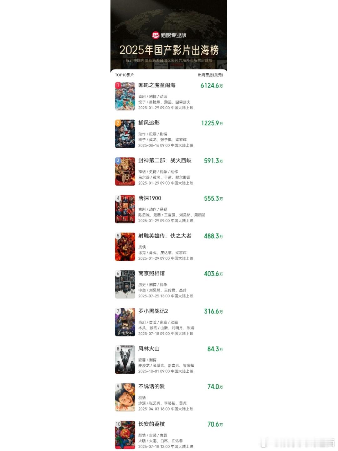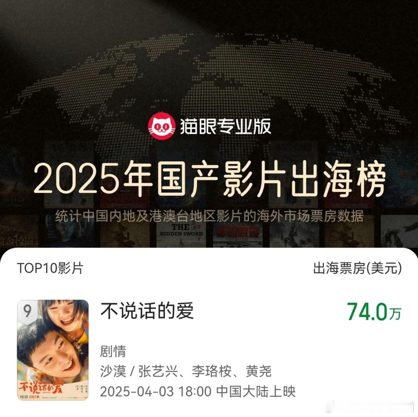 张艺兴电影《不说话的爱》上榜2025国产电影出海榜,票房统计排名第九名~ 应该是唯一上榜的剧情类小成本电影 🎬好电影值得,恭喜小马爸爸张艺兴~