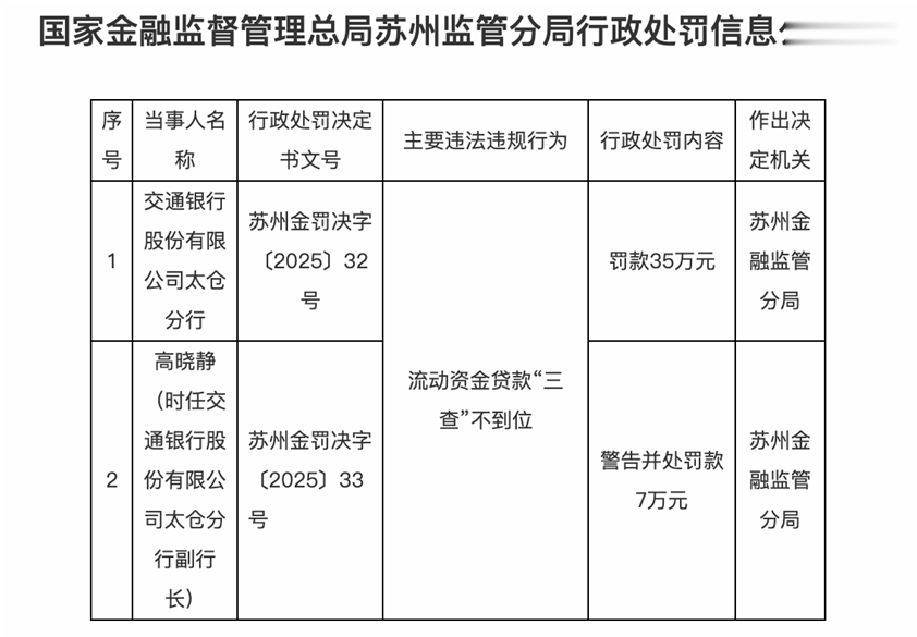 交通银行股份有限公司太仓分行因流动资金贷款“三查”不到位,被罚款35万元,高晓静(时任交通银行股份有限公司太仓分行副行长)被警告并处罚款7万元。