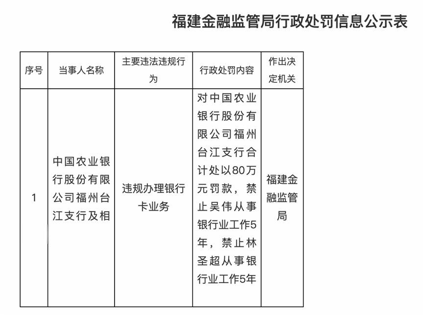 2026年1月4日,国家金融监督管理总局官网披露,中国农业银行股份有限公司福州台江支行及相关责任人因“违规办理银行卡业务”,监管部门对中国农业银行股份有限公司福州台江支行合计处以80万元罚款,禁止吴伟从事银行业工作5年,禁止林圣超从事银行业工作5年。