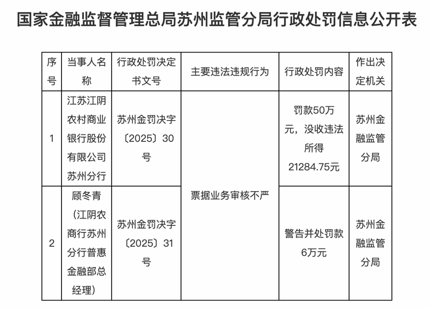江苏江阴农村商业银行股份有限公司苏州分行因票据业务审核不严,被罚款50万元,没收违法所得21284.75元,顾冬青(江阴农商行苏州分行普惠金融部总经理)被警告并处罚款6万元。