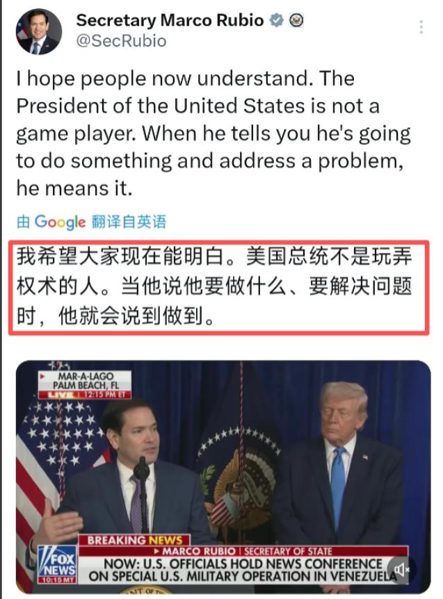 美国国务卿鲁比奥 1 月 4 日发文写道:“我希望大家现在能明白。美国总统不是玩弄权术的人。当他说他要做什么,要解决问题时,他就会说到做到。” 鲁比奥的这一番表态,堪称霸权主义的自白书! 鲁比奥一开口,就把特朗普夸成了 “说到做到” 的实在人,可大家都能看出来,这哪是在夸总统,分明是给美国的霸道行为贴金呢! 鲁比奥这波彩虹屁吹得,简直把霸权包装成了 “诚信标兵”,可明眼人都清楚,他自己就是靠紧跟特朗普才坐稳国务卿宝座的。 这位身兼四职的古巴裔政客,早年还跟特朗普抢过总统宝座,惨败之后转头就成了特朗普最忠实的 “传声筒”,99 票全票通过的国务卿任命,说白了就是靠 “听话” 换来的。 现在他吹捧特朗普 “说到做到”,不过是在给自己的政治前途铺路,毕竟特朗普的政策越被认可,他这个执行者的地位就越稳固。 特朗普所谓的 “说到做到”,说白了就是 “我说打谁就打谁,我说制裁谁就制裁谁”。之前放话要收拾委内瑞拉,转头就派特种部队把马杜罗从军营里掳走,押到纽约受审,鲁比奥还紧跟着放话,说不排除派地面部队的可能,甚至有消息说他自己都要当委内瑞拉 “总督” 了。 之前承诺要强化对委制裁,就立刻冻结了 4 家委内瑞拉石油公司资产,封锁加勒比海域,搞得委内瑞拉石油出口被迫减产 50 万桶 / 日。 还有那 9010 亿美元的国防授权法案,说要涨军费就涨军费,说要在边境部署部队就部署部队,完全不管国际社会怎么看。 经济上的 “说到做到” 更是赤裸裸的霸权操作。特朗普说要对家具、橱柜加征关税,转头就发布公告,后来只是因为民众不满物价才推迟一年,根本不是真心顾及全球贸易。 世贸组织都因此把 2026 年全球货物贸易增长预期下调到 0.5%,可美国压根不当回事,该制裁的制裁,该加税的加税,把 “美国优先” 刻进了骨子里。 鲁比奥还跟着帮腔,说这是 “解决问题”,可这些问题全是美国自己定义的,解决方式就是牺牲别国利益,说白了就是 “我的规则就是世界规则”。 鲁比奥嘴里的 “解决问题”,其实就是用拳头和制裁解决 “不听话” 的问题。美军 “南方之矛” 行动打着缉毒的幌子,在委内瑞拉附近海域多次开火,已经打死逾百人,这哪里是解决问题,分明是制造混乱。 特朗普说要摧毁委内瑞拉的 “威胁设施”,美军就立刻动手,完全无视委内瑞拉的国家主权。更讽刺的是,鲁比奥一边说不搞占领当局,一边却在暗中推动政权更迭,十多年来就没停止过针对马杜罗政府的动作,这种 “说到做到”,不过是霸权主义的遮羞布。 国际社会早就看清了美国的套路,只是敢怒不敢言。世贸组织警告贸易保护主义会拖累全球经济,可美国该怎么干还怎么干;联合国多次谴责美国单边制裁,鲁比奥们根本不当回事。 就连美国的盟友,也在悄悄远离这种 “说到做到” 的霸权,毕竟谁也不想哪天自己成了美国 “解决问题” 的目标。 鲁比奥还在自欺欺人地吹捧,却忘了霸权越是嚣张,反对的声音就越是强烈,所谓的 “说到做到”,早晚会变成 “众叛亲离”。