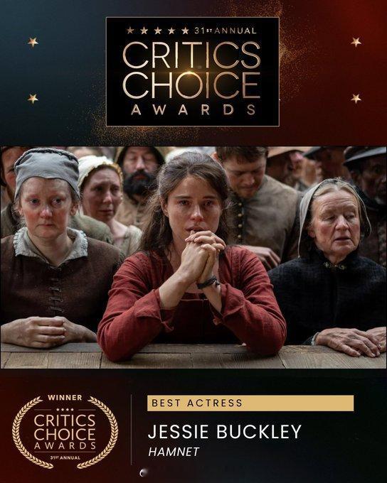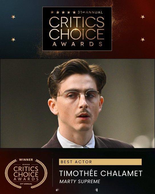 奥斯卡 风向标之一的第31届评论家选择奖(critics choice awards)公布获奖名单,《一站再战》无悬念拿下BP与BD,甜茶获得影帝,萝丝·拜恩未能拿下影后。比较令人开心的是《火车梦》获得了最佳摄影,搞笑的是《猎魔女团》这种剧情稀烂的电影击败了《疯狂动物城2》《你好,爱美丽》《地球特派员》获得了最佳动画电影🥶真是不知道说什么好。最佳影片:《一站再战》最佳导演:保罗·托马斯·安德森《一站再战》最佳男主角:蒂莫西·查拉梅《至尊马蒂》最佳女主角:杰西·巴克利《哈姆奈特》最佳男配角:雅各布·艾洛蒂《弗兰肯斯坦》最佳女配角:埃米·马迪根《凶器》最佳新人:迈尔斯·凯顿《罪人》最佳群戏:《罪人》最佳原创剧本:《罪人》最佳改编剧本:《一站再战》最佳动画片:《K-POP:猎魔女团》最佳外语片:《密探》最佳喜剧片:《白头神探:智斗灭世狂人》最佳剪辑:《F1:狂飙飞车》最佳摄影:《火车梦》最佳特技:《碟中谍8:最终清算》最佳配乐:《罪人》最佳歌曲:《K-POP:猎魔女团》最佳音效:《F1:狂飙飞车》最佳美术设计:《弗兰肯斯坦》最佳妆发:《弗兰肯斯坦》最佳服装设计:《弗兰肯斯坦》最佳视觉效果:《阿凡达:火与烬》
