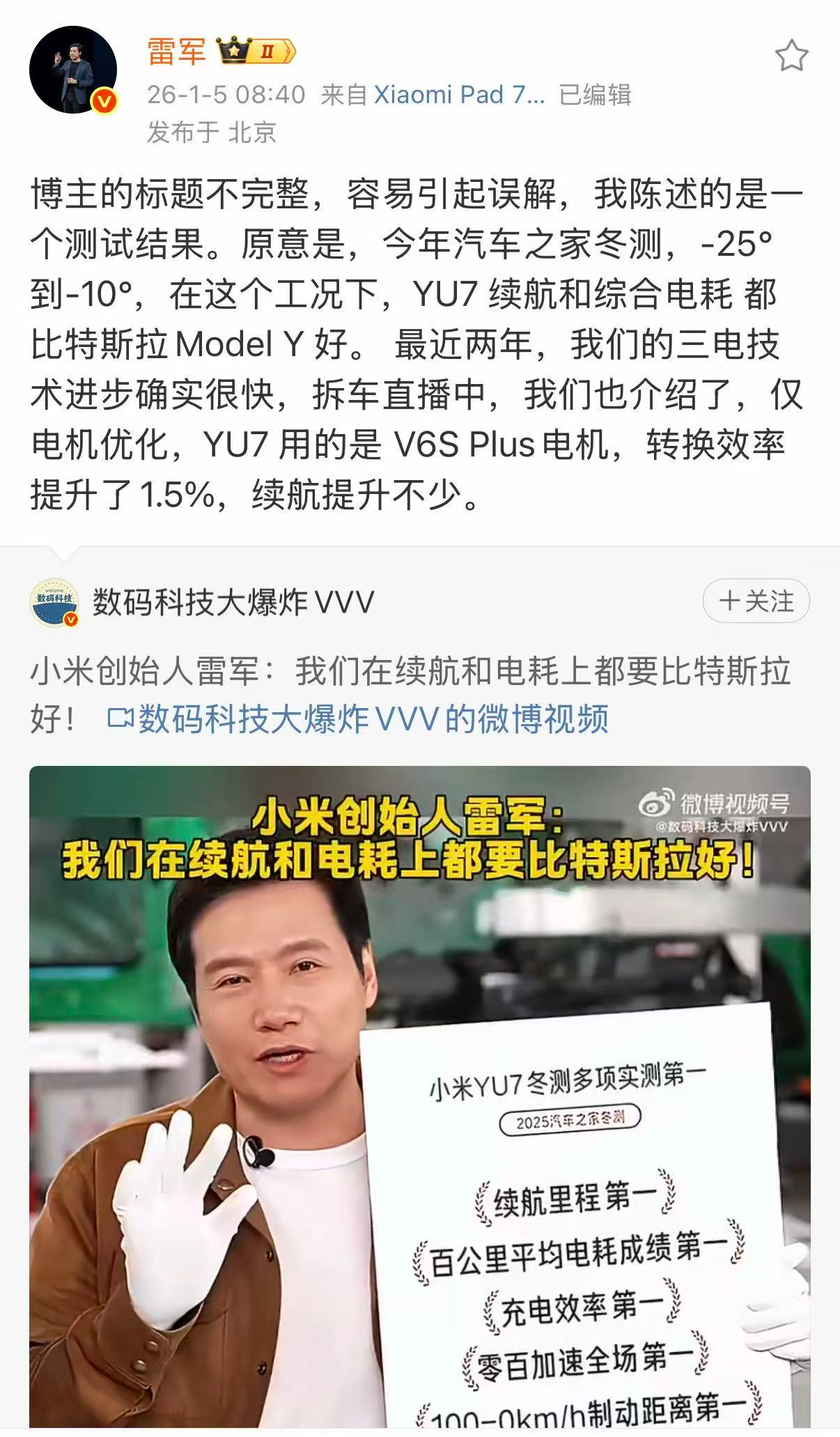 【雷军纠错某大V视频标题 :标题不完整,容易引起误解!】1月5日,雷军转发某博主标题为“小米创始人雷军:我们在续航和电耗上都要比特斯拉好!”的视频,并解释称:“博主的标题不完整,容易引起误解,我陈述的是一个测试结果”。雷军进一步指出,“原意是,今年汽车之家冬测,-25°到-10°,在这个工况下,YU7 续航和综合电耗 都比特斯拉Model Y 好。 最近两年,我们的三电技术进步确实很快,拆车直播中,我们也介绍了,仅电机优化,YU7 用的是 V6S Plus电机,转换效率提升了1.5%,续航提升不少。雷军2026年第1次健身房打卡
