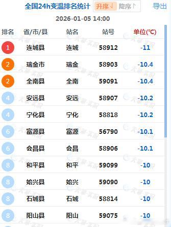 【气温波动】今天冷空气+阴雨,导致南方部分地区出现6-10℃降温。福建连城降11℃、江西瑞金降10.4℃、全南降10.4℃,云南富源降10.1℃、广东和平、始兴、阳山降10℃,为各自省份14时降温最强站点。在冷空气和降水过后,长江中下游多地气温回升。