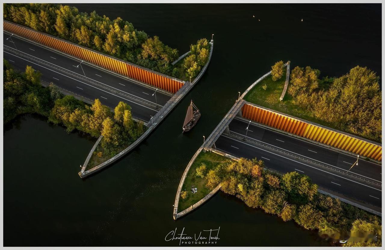 这个独特的建筑是位于荷兰的费吕沃湖水道桥(Veluwemeer Aqueduct),它是一项巧妙的工程壮举。 该水道桥位于荷兰东部的哈尔德韦克(Harderwijk)附近,横跨费吕沃湖(Veluwemeer)。 荷兰的工程师们决定采用水桥而非传统的升降桥或昂贵的隧道方案,以确保N302公路和船只交通都能不间断地通行。 结构: 水道桥长25米,宽19米,水深3米,足以容纳小型船只和吃水较浅的船只安全通过。 交通: 每天约有28,000辆汽车从水道桥下方的公路通过,而上方则有船只和行人/自行车道。 材料: 桥体使用了约22,000立方米的混凝土和钢板桩,以承受水体的巨大重量,并防止湖水渗漏到下方的公路上.。