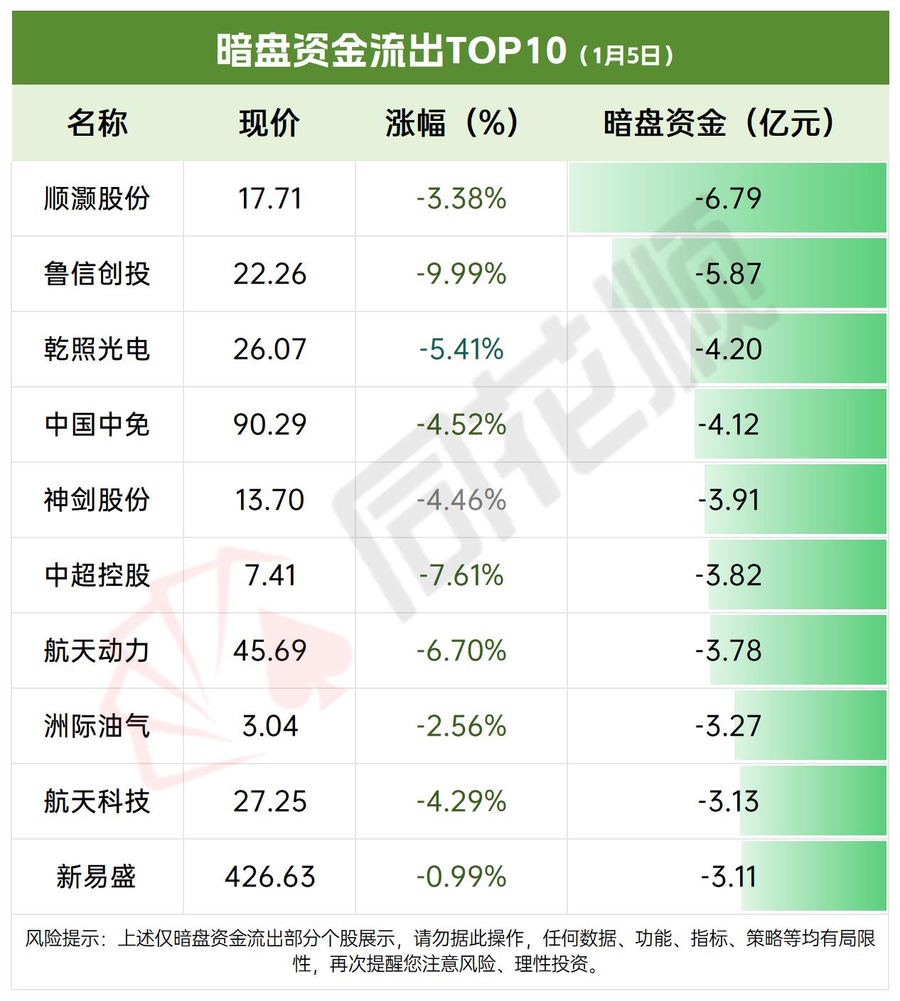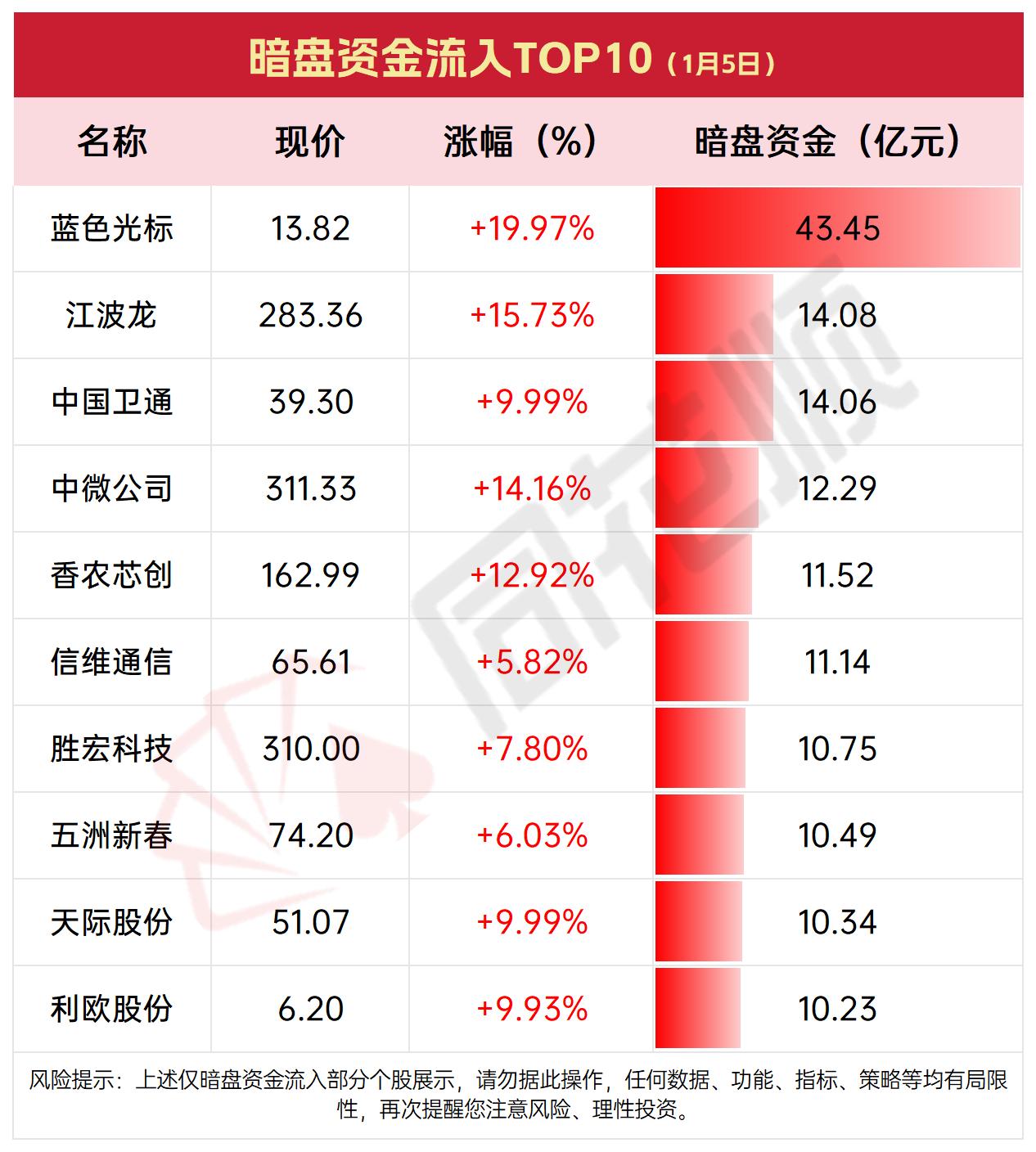 1月5日,周一A股主力暗盘资金一览表!!! 今日,大A成功实现12连阳,主力资金流入192.51亿,暗盘资金大幅流入1012.64亿,蓝色光标主力暗盘资金大幅流入43.45亿,后市值得高看一眼;江波龙主力暗盘资金大幅流入超14亿,后市值得期待;顺灏股份主力暗盘资金大幅流出6.79亿,后市需小心谨慎;鲁信创投主力暗盘资金流出超5亿,后市需注意风险!!!