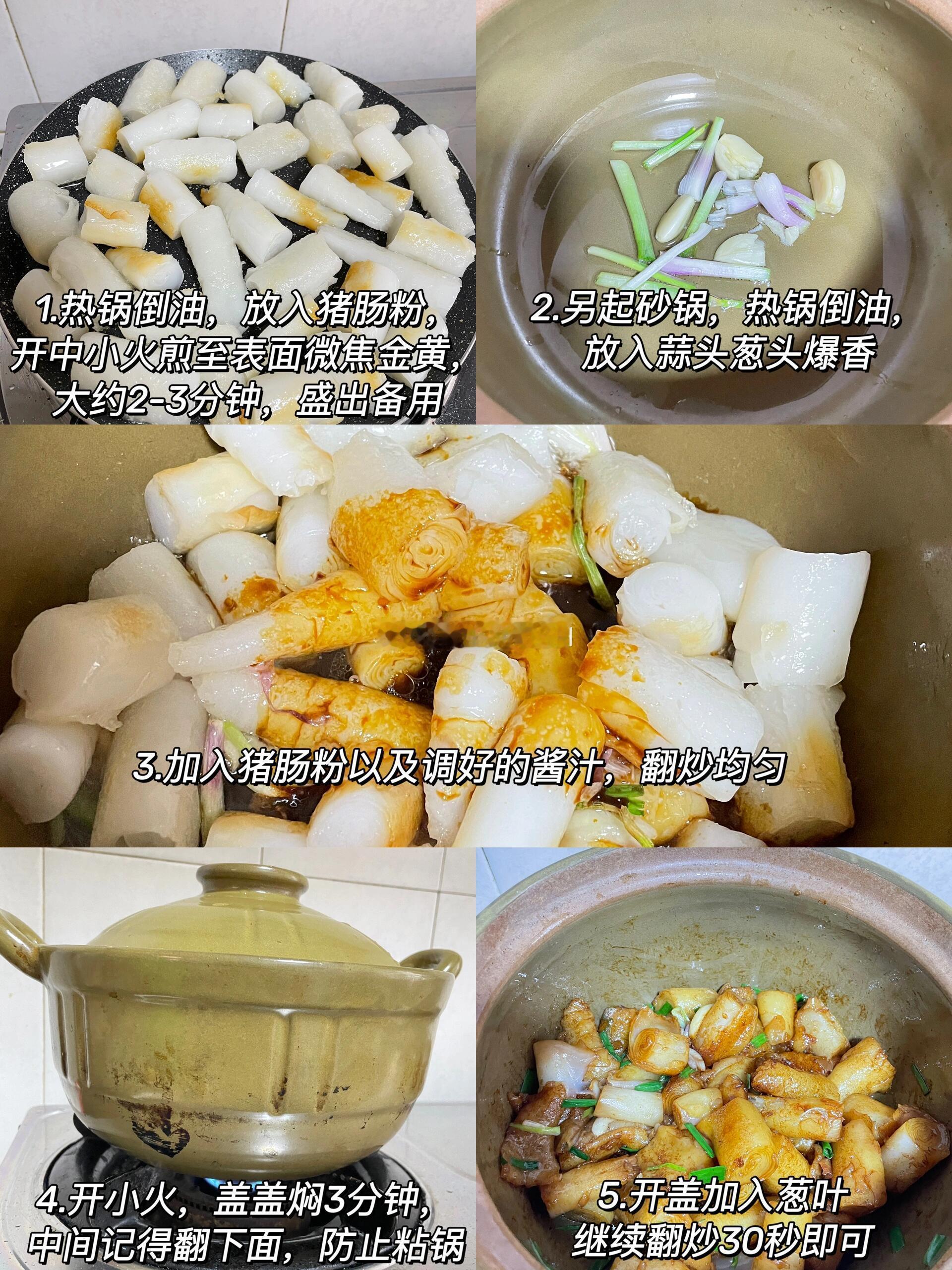广东砂锅肠粉好特别的做法广式啫啫猪肠粉|家常复刻零失败!简单食材+秘制酱汁,锅气十足超惹味,一人食也能吃得满足!😋📝 食材清单 • 主料:猪肠粉 530g • 辅料:蒜头 4瓣、香葱 20g • 秘制酱汁(小铁勺计量):生抽 2勺、蚝油 1勺、柱候酱 1勺、老抽 1勺、白糖 1茶勺、白胡椒粉 少许、清水 半碗(搅拌均匀备用)👩🍳 制作步骤 1. 前期准备猪肠粉切小段;蒜头拍碎;香葱洗净,葱头和葱叶分开切段。 2. 煎制肠粉热锅倒油,放入猪肠粉,中小火煎2-3分钟至表面微焦金黄,盛出备用。 3. 砂锅爆香另起砂锅,热锅倒油,放入蒜头、葱头爆香,加入猪肠粉和调好的酱汁,快速翻炒均匀。 4. 焖煮出锅小火盖盖焖3分钟(中途翻一次防止粘锅),开盖加入葱叶,翻炒30秒即可出锅!⚠️ 美味小贴士 1. 嗜辣星人可在酱汁里加一勺辣椒油,香到舔盘~ 2. 多放香葱或加少许肉末更香!想更入味可延长焖煮至5-6分钟,记得勤翻动。 我的年度美味清单好好吃饭的一年晒出我的年度兴趣 网页链接