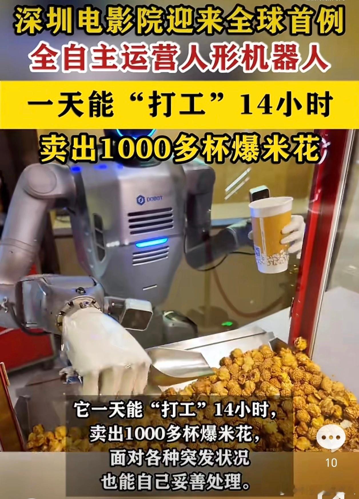 全球首例全自主运营机器人影院上岗完喽,又一个岗位被人工智能取代了,关键是14小时连轴转还能卖上千杯爆米花,也太能扛了。抓杯子、装爆米花动作超丝滑,完全不用人工帮忙,这才是真正的超级牛马,深圳的科技进度条是真的拉满了。