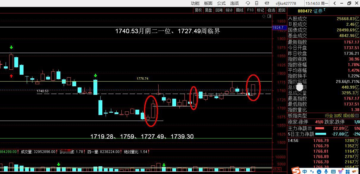 证券指数12月5日刹车,12月17日换挡,今天的次阳零号跳空高开过月大阴二一位1740.53,前面讲过,只要是带构建过了这个位置,月线就反转了, 那么证券这里就不能看空,但是今天证券合力一般,因此明天观察能不能再出一个中大阳去站稳2024年10月9日证券的全局高量实顶1776.74,也就是1777,有效突破这里,必须靠中到大阳。此外上证指数,上方的重要阻力4071、4098、4125、4184,走一步看一步。明天周二,主要观察市场上线下线设置510210 上证指数ETF 上线1.01、下线1.005IFL8 沪深主连 上线4723、下线4662999999 上证指数 上线4034、下线4005880472 证券 上线1777、下线1752300059 东方财富 上线24.07、下线23.49880493 软件服务 上线3045、下线2992000016 上证50 上线3166、下线3078512880 证券ETF 上线1.243、下线1.225这里虽然不看空,但证券节奏始终慢于上证,加之这个位置是12月17日反弹以来的第12天,即便能得到证券走强带动,也不能盲目乐观激进,保持谨慎,跟随市场,下次走弱还是要坚决离场。