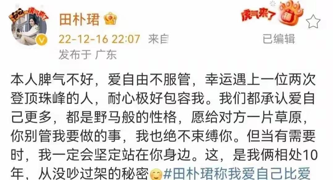 田朴珺问王石:“我觉得我们都是爱自己更多的人,你承认吗?” 王石承认后,田朴珺:我说我也觉得我爱我自己比爱别人多 看了当初两人视频的对活,我看到了王石的落寞,他希望听到田更爱他,哪怕是假的,最后他还放低姿态说自己愿意改变,喜欢上一个有野心的女人,基本上要有铺好路后掌控不了她的觉悟 王石的前妻有可能爱他多过自己 他与田朴珺,肯定是王的女人只爱自己,天平上王石的重量靠的是钱和名望。 自从和小田结婚,王石瘦了一大圈,年纪显得更老,精气神也没有了。而田朴珺的精神相貌:更显得风彩、自豪!田朴珺是慕强女性的代表人物,只爱强者,王石英雄老矣,待光环褪去,缺乏吸引力和神秘感的老头,只剩一脸沧桑和悲凉, 英雄老去和美人迟暮,都是让人无奈却又想向天再借五百年的遗憾,如果王石今天是40岁年轻意气风发的时候,一切又都不同了,人啊。 王石人生第一次下厨是为心爱的人田朴珺做红烧肉。 田朴珺在社交平台秀恩爱配文 “终于吃到笨笨的红烧肉了,太好吃了!一口气吃了半锅! 红烧肉好吃啊~不求天长地久,只要曾经拥有[666]王石
