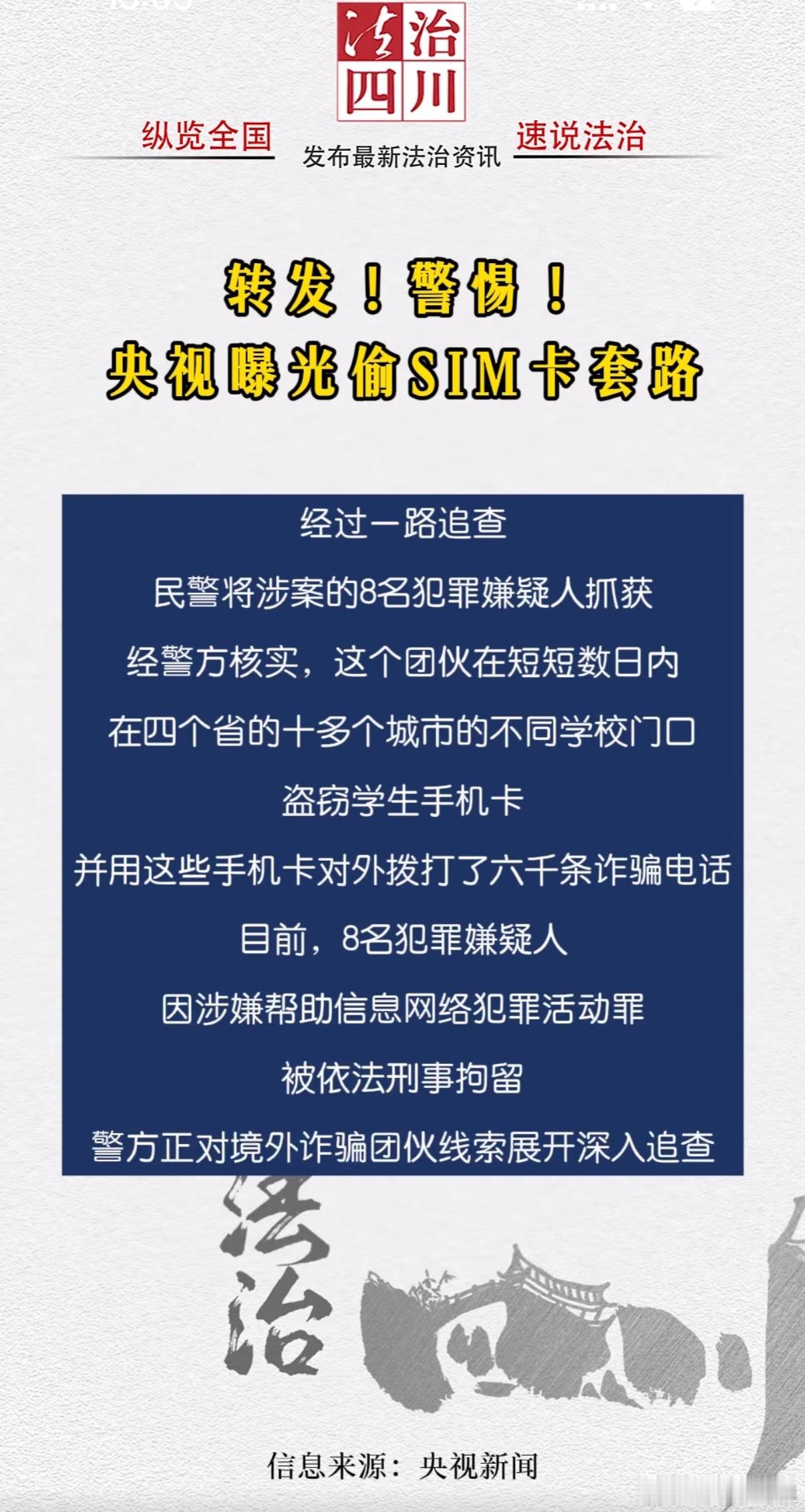 央视曝光偷SIM卡套路偷手机SIM卡是真可恨,犯罪分子抓住了学校不让带手机的漏洞,偷孩子的卡用来犯罪,犯罪风险全让SIM卡实名人担了,而且我觉得现在学校不让带手机也有点不合适,有的学生自己上下学,路比较远,没有手机根本没法做到有事及时联系家长,做个手机柜什么的,就能大大减少这类风险