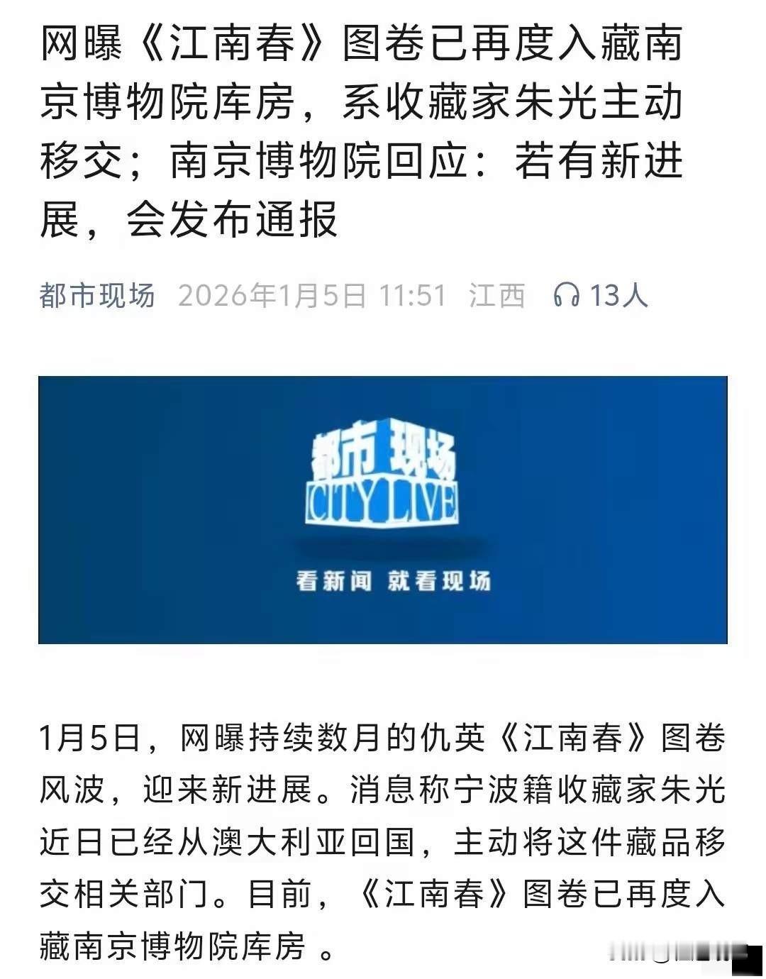 能把画还回来,可以算是识时务了。 仇英的《江南春》已经被重新移交给南京博物院了,据说是一位收藏家从澳大利亚火急火燎的赶了回来,连大气也没喘就把这幅《江南春》还给了南京博物院。 据说此前花了5000多万买的,现在一看局势不太对,赶紧无偿捐赠了,也算是舍利为义了。 还有人说要把这幅画鉴定一下,其实完全没必要,再蠢的人也不敢在这个时候拿一幅仿的来凑数吧。