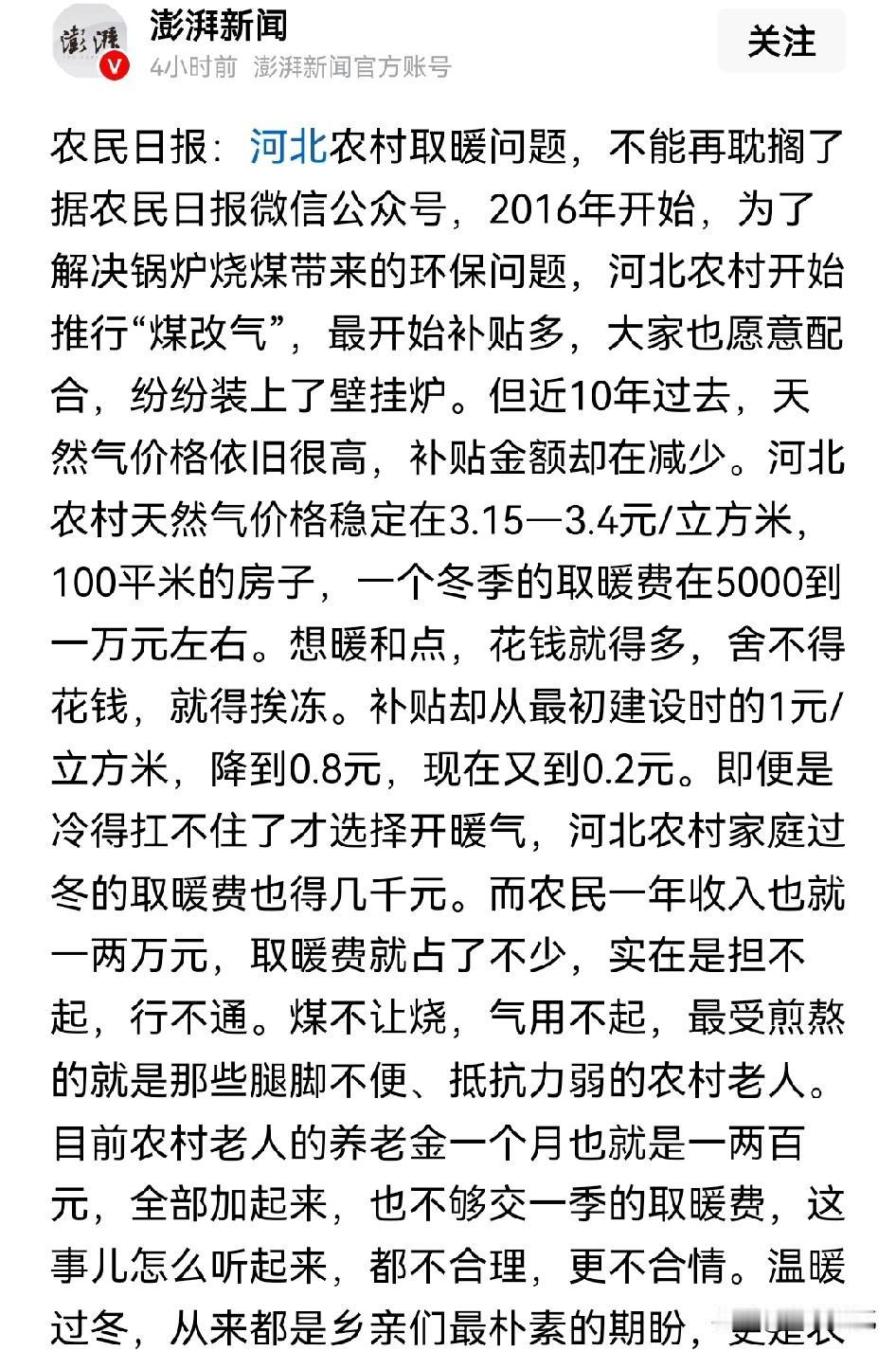最近都在关注河北农村的取暖, 在取消了燃气补贴之后,3块多每立方米的价格,农村没有几户能够承受得住用这个取暖。 农村的房子又高又大,而且保暖性可能不太好,所以一个冬天下来要六七千,还可能要达到一万多,这还是在白天不怎么开,只是晚上有那么点温度的情况。 年轻人还好点儿,最起码有收入,最难的就是那些老年人,一个月二百多块钱的养老金,谁会舍得烧。