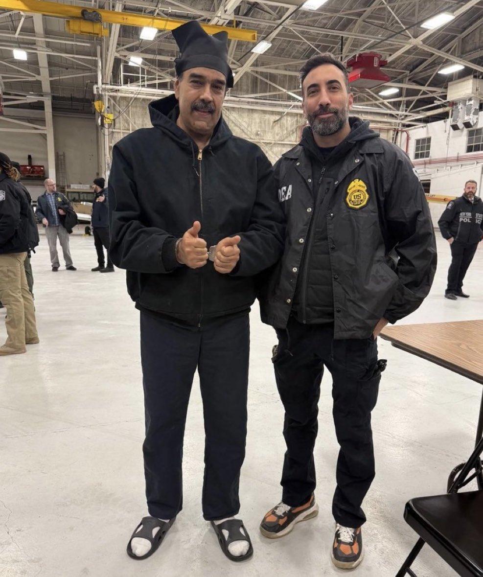 马杜罗跟美国缉毒局工作人员合影,帽子,手铐,大拖鞋,白袜子一样没少。 给人有很放松,心里非常踏实,有成功上岸的感觉。[奸笑] 南评:实话实说,马头领还是很平易近人的。