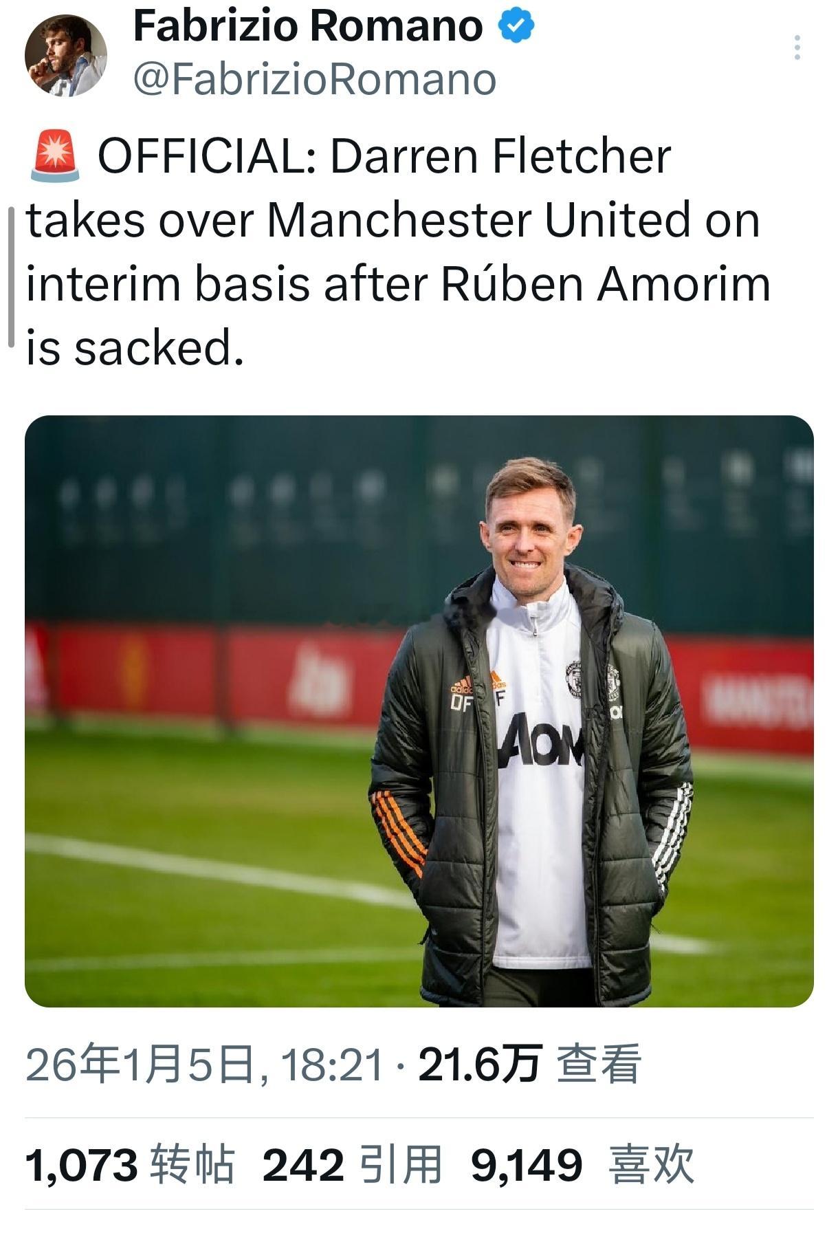 罗马诺曼联将任命达伦弗莱彻 为曼联的看守教练