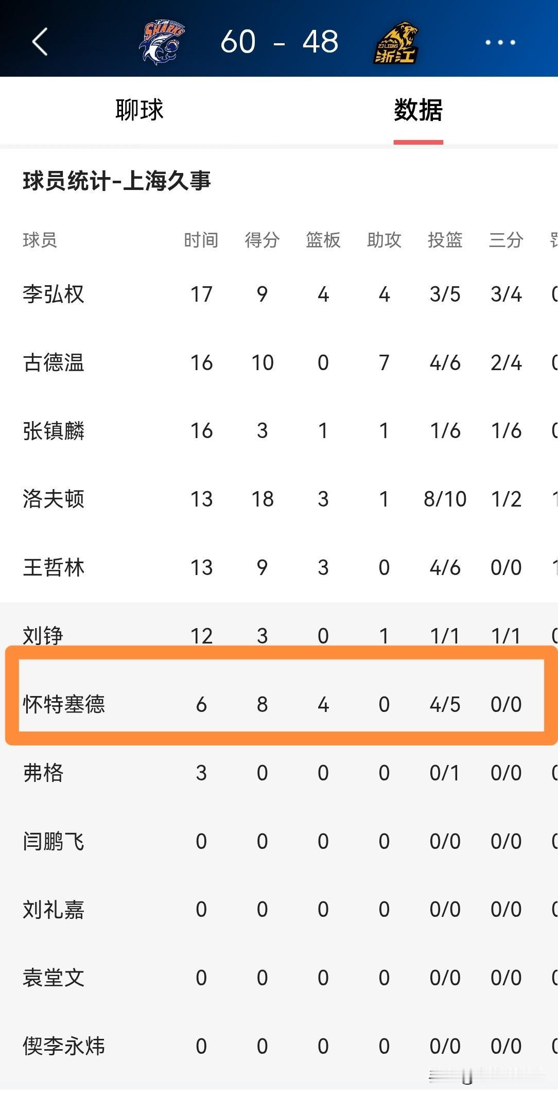 我一定要怒赞上海久事老将怀特塞德!在今天上海久事主场迎战浙江方兴渡的比赛中,目前双方半场战罢,上海久事暂时以60:48领先对手。在前两节比赛中,怀特塞德仅仅替补出战6分钟,投篮5中4非常高效的得到8分,还有4篮板,其中包括3个前场篮板,他的场上正负值为+5。 虽然怀特塞德已经35岁了,但是他在攻防两端依然能够为球队提供非常大的帮助。