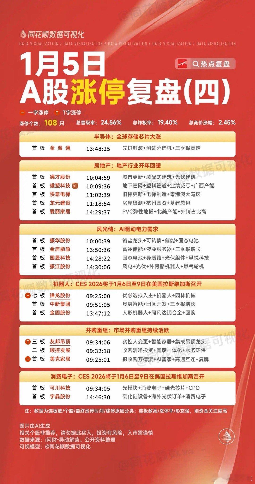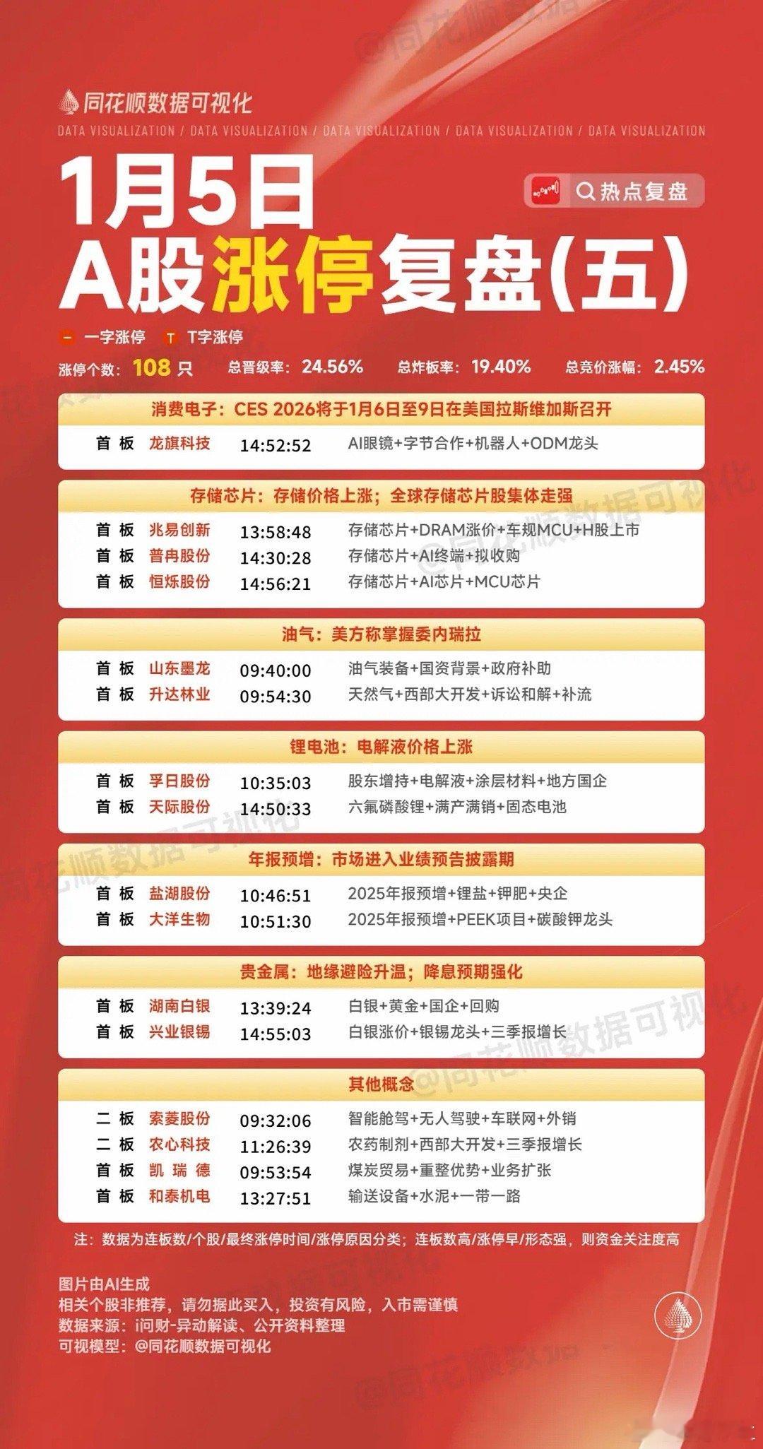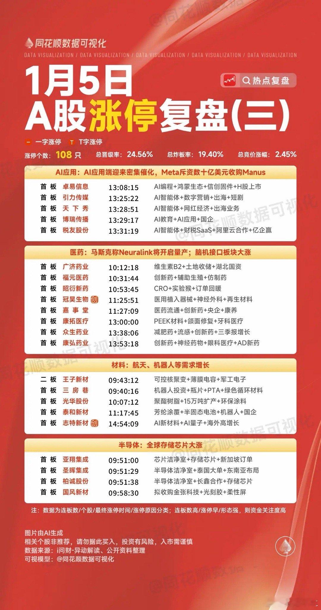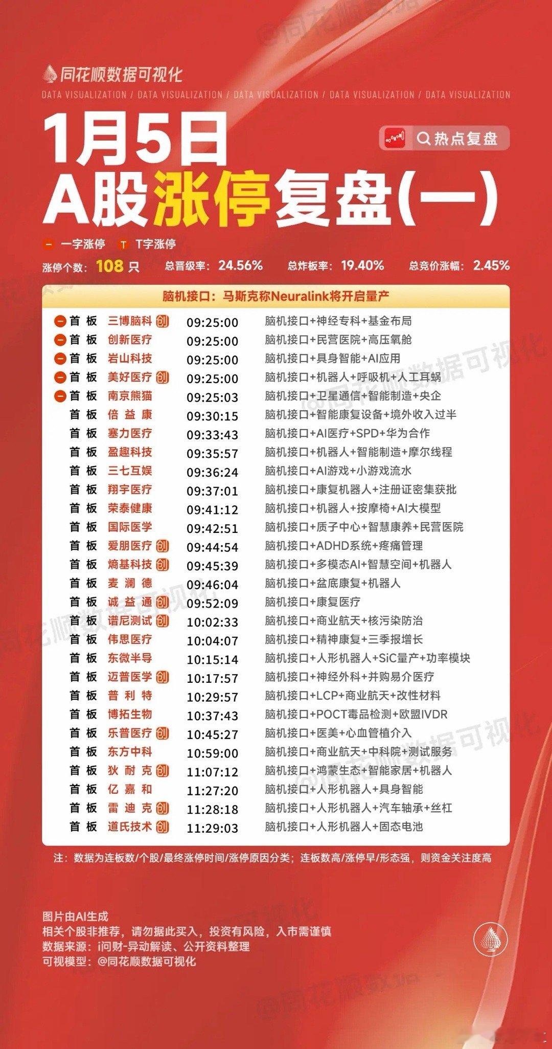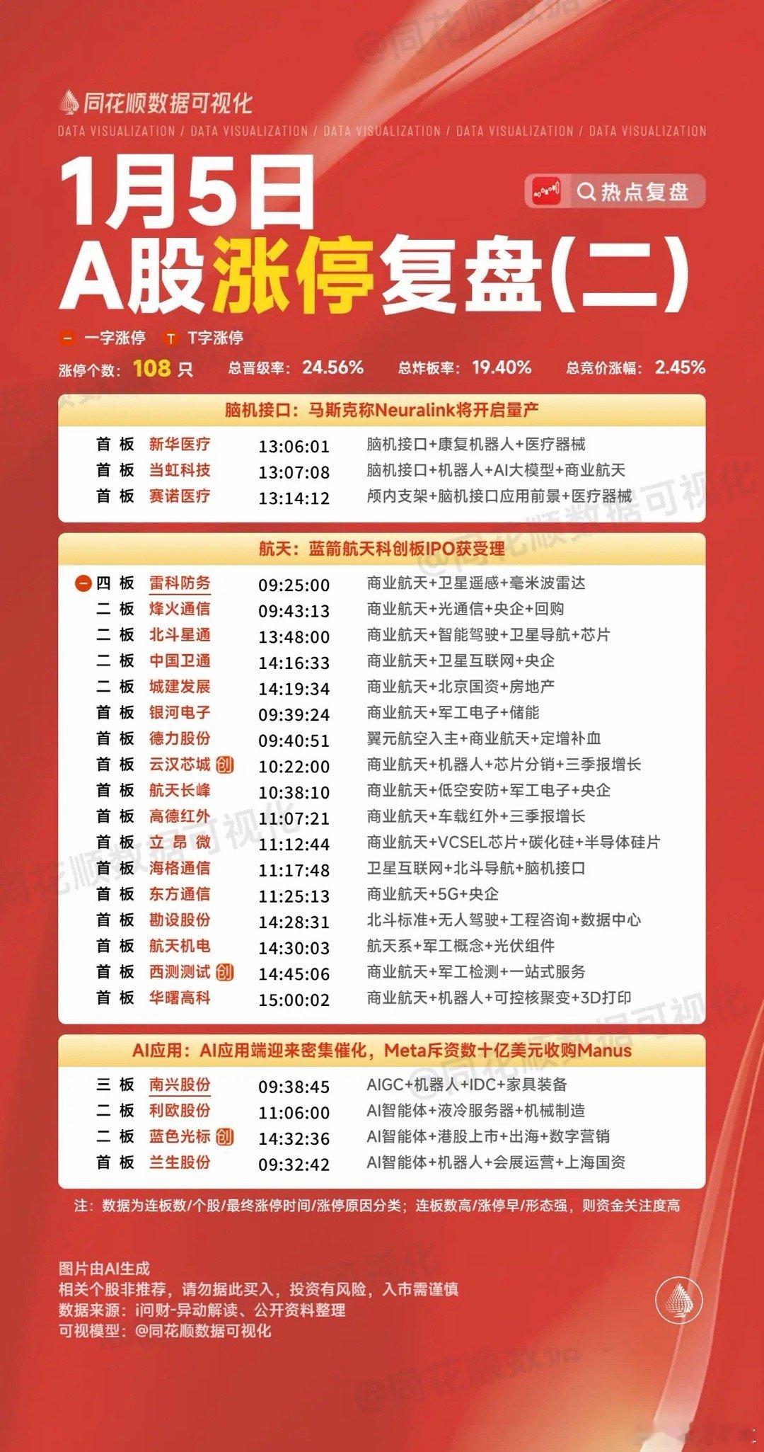 1月5日复盘:利欧股份、岩山科技、中国卫通、天际股份、五洲新春隔日走势的一些看法!1、利欧股份(AI应用)利欧竞价6个多点的高开是非常强势的,但是开盘后是有明显资金兑现抢跑,好在它整体承接非常不错,再加上南兴快速顶住分歧上板,利欧在放出足够量能后很快出现资金承接上板,但是盘中它还是出现了大资金砸盘兑现,好在分时均线有强承接,最终还是在早盘彻底封死涨停,走出了一个明显的放量连板形态!盘后的龙虎榜消闲派、东亚前海苏州分、东吴西藏南路几个游资席位都是做T引导,卖盘西大街止盈了大部分资金,东北青岛分、中信吴宁西路也是止盈,首板介入的万豪世家并没有出现在卖盘榜,这样的榜单还是非常不错的,多个游资席位选择格局引导,而且从今天AI应用整体的表现看,还是有一定持续性的,身位个股南兴晋级,两只辨识度高的首板利欧和蓝色也同时晋级,而且这两只个股还是容量个股,这样的表现是超强的,隔日继续冲高问题不大,而且今天市场大幅放量,所以利欧这种盘子个股并不存在走不了高板的问题,只要整个AI应用方向能够持续,利欧的表现还是值得期待的,但是它今天整体涨停形态确实一般,隔日想要连板还是比较困难的,除非板块和个股都有明显转强表现!2、岩山科技(脑机接口)脑机接口方向出现大利好,所以今天整个脑机接口方向出现了强势的高潮表现,岩山作为这个方向辨识度非常高的个股,也是大单一字开盘,并且全天没有出现明显放量,最终走出了一个非常强势的一字板!今天整个脑机接口方向是大爆发,隔日前排个股肯定依然是高溢价,岩山、创新和熊猫毫无疑问是最核心的三只个股,隔日就算开板放量,也是资金的首选,所以岩山隔日涨停的溢价大概率有保证,至于它会不会给到接力机会,就要看整个脑机接口的分歧程度了,如果整体分歧不大,岩山的开板放量或许还是机会,就看它开板后的承接力度了!3、中国卫通(商业航天)早盘雷科大单一字板的表现非常强势,但是开盘后市场被脑机接口吸引去了大部分资金,商业航天整体反而出现了明显的回调,但是卫通在竞价偏弱的情况下反而开盘就有拉升,在高位横盘放量后,有资金承接去拉板,虽然午后受情绪影响出现炸板,但是最终还是有资金承接封死涨停!盘后的龙虎榜是3日榜,买盘除了作手新一,多数是做T的量化和兑现的游资,这算是一个明显的资金换手榜单,卫通今天的涨停有接力卫星的趋势,毕竟卫星之前走出了4连板的形态非常强势,卫通的流通市值比卫星还大,但是它整体的位置相比卫星偏低,所以资金高低切换中军的情况下选择了卫通,那么它隔日继续趋势向上的概率还是很大的,但是整个商业航天高低切换明显,卫通整体的位置还是偏高的,想要继续连板概率非常小,但是隔日走出冲高的溢价应该会有保证!4、天际股份(锂电)碳酸锂期货早盘继续大涨,天际竞价也是明显的高开,但是它开盘拉升无力的情况下出现了明显的分歧下杀,好在碳酸锂期货在10点30分之后再次出现明显拉升,天际走出了跟随上涨,午后在碳酸锂期货高潮的情况下出现资金强势拉升上板,虽然板上分歧明显,但是最终还是在尾盘彻底封死涨停!盘后的龙虎榜消闲派、越王大道新进介入,陈小群和江苏路继续做T,整体的榜单还是非常不错的,天际整体板块效应确实一般,它完全是跟随碳酸锂期货的行情趋势上涨,但是盘后的榜单出来后,隔日是有冲高概率的,但是想要走出持续性更多的取决于碳酸锂期货会不会共振上行!5、五洲新春(机器人)早盘竞价机器人的表现是偏弱的,五洲低开其实是严重低于预期的,但是开盘后五洲走出了明显的拉升强势表现,再加上三花有共振上涨,所以是有强势资金去承接封板的,可惜板块整体不给力,五洲受情绪影响在盘中出现资金抢跑兑现,之后资金回封意愿并不强烈,最终走出了一个明显的高位断板形态!盘后的龙虎榜买盘是沪股通和4个量化席位,卖盘则多了一个机构和一个止盈的潜伏盘,这样的榜单完全是量化引导的,在现阶段的市场并不陌生,而且今天五洲早盘开盘后的弱转强非常明显,是有明显大资金介入强势做多的,隔日至少不会太难看,而且今天五洲整体的筹码置换是非常充分的,获利资金并不多,再加上锋龙持续强势,机器人整体趋势还在,隔日一旦机器人方向出现明显修复,五洲走出修复的概率还是非常大的,所以这只个股早盘可以重点关注它拉升后的抛压,如果能够站稳今天的涨停价,就可以期待一下,反之,则是很可能冲高兑现的走势,所以就要去找卖点了!本文只限于分享和交流,不构成投资建议,股市有风险,投资需谨慎!