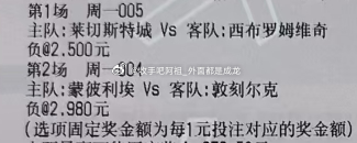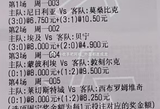 四场方向:002 非洲 埃及vs贝宁003 非洲 尼日利亚vs莫桑比克004 法乙 蒙彼利埃vs敦刻尔克005 英冠 莱切斯特vs西布罗姆