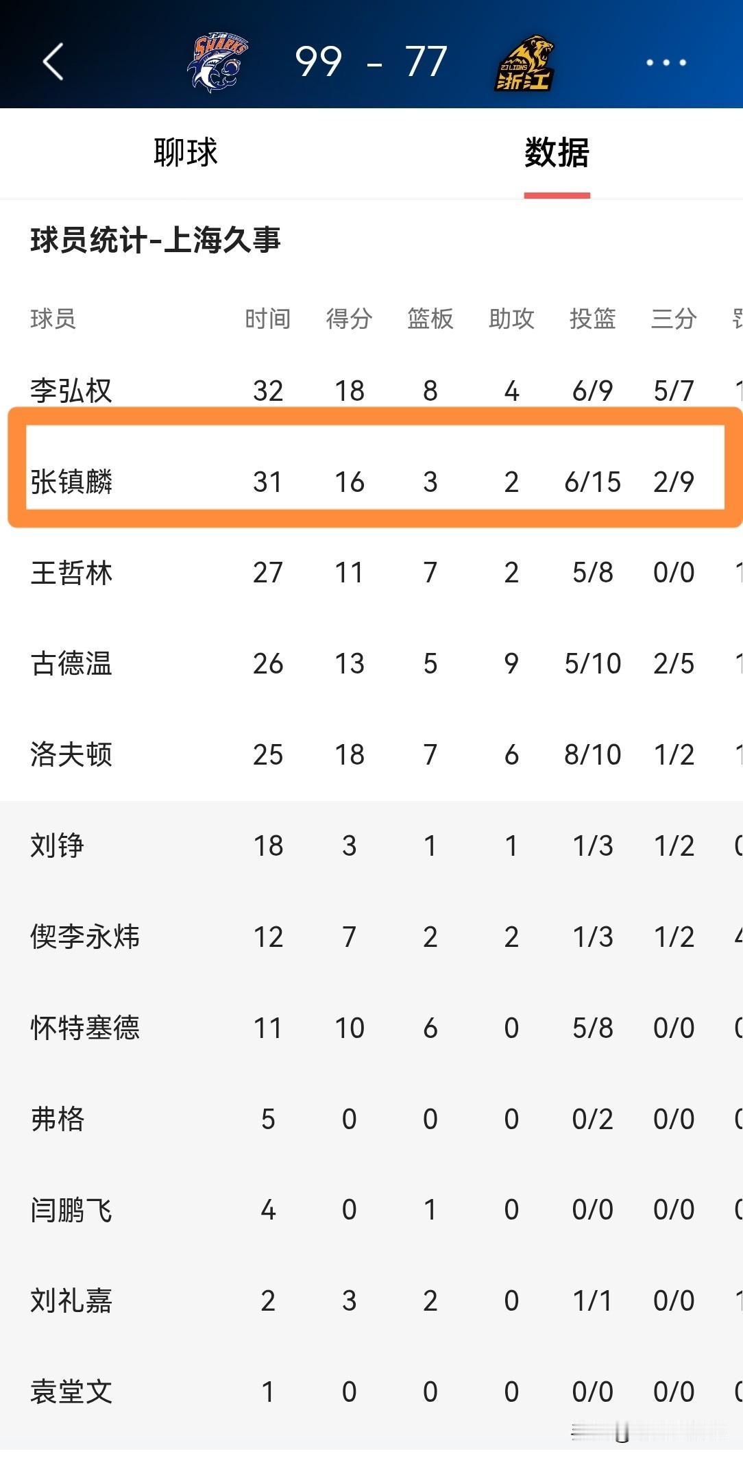上海久事超级球星张镇麟真是球队的末节之王!在今天上海久事主场以99:77大胜浙江