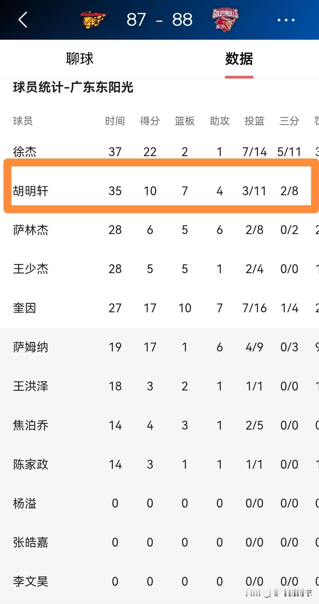我真是懒得批评广东东阳光球星胡明轩了!在今天广东东阳光主场以87:88不敌浙江稠州金租的比赛中,胡明轩首发出战35分钟,投篮11中3,其中三分球8中2、罚球4中2非常低效的得到10分,他的场上正负值为-5。 坦白说,胡明轩绝对是广东东阳光输球的两大罪臣之一,另一个就是外援萨林杰,本场比赛胡明轩和萨林杰的表现简直是惨不忍睹。