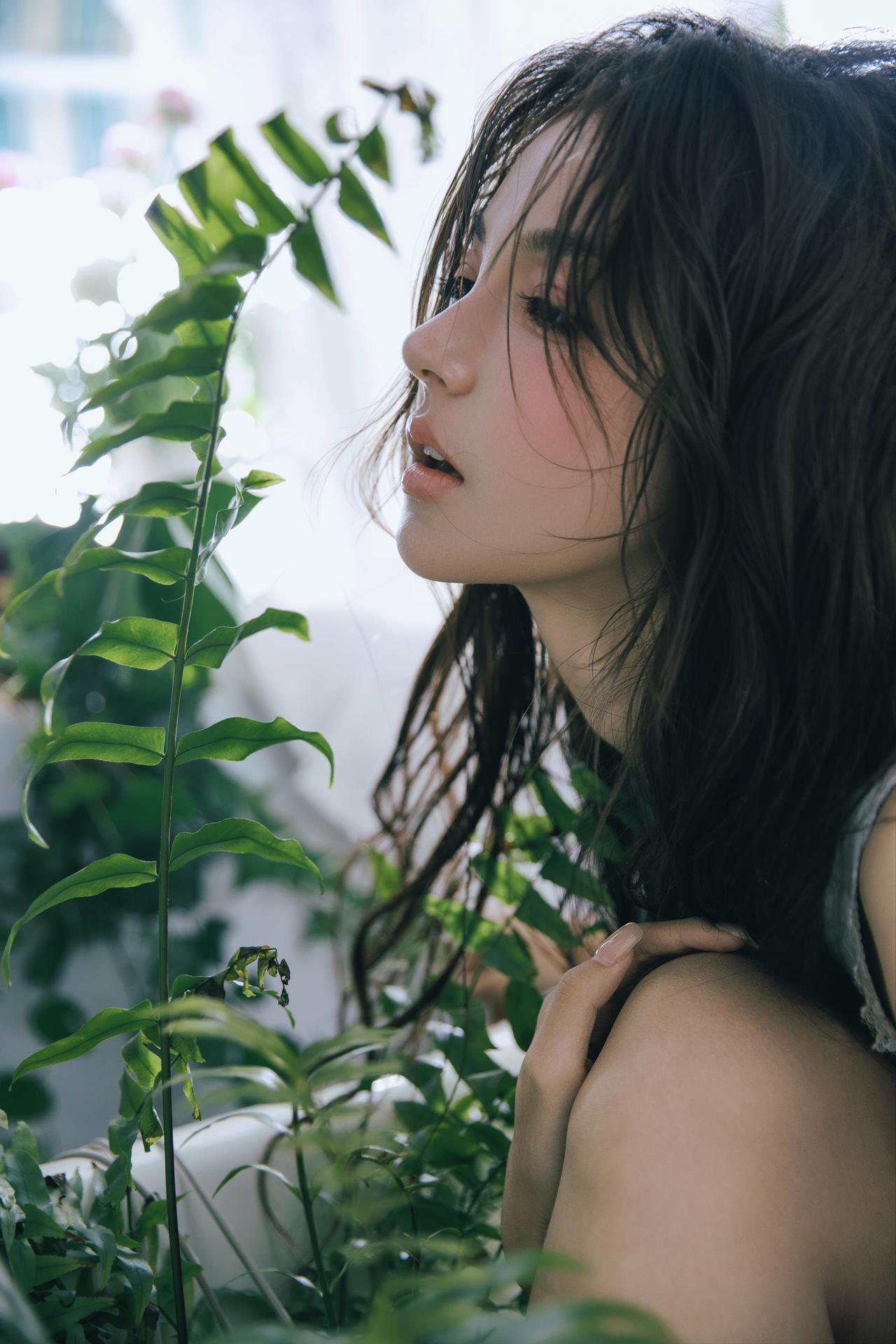 这张中景作品的光影与绿植布景的结合堪称经典。窗光从人物后方斜射而来,形成柔和的轮廓光,将人物的发丝与肩部轮廓从绿植背景中剥离,同时让叶片的边缘呈现出通透的高光,绿植的层次感被充分展现。人物的侧身姿态与垂吊的常春藤形成平行的线条关系,画面的韵律感被强化;腿部的叶片点缀则打破了白色服饰的单调,让绿植的元素贯穿整个画面。 色彩上,绿植的深绿与人物的浅白形成明暗对比,窗光的自然色温让肤色还原精准,叶片的色彩饱和度适中,没有出现过艳的问题。但人物腿部的叶片摆放稍显刻意,且地面的黑白瓷砖线条分割了画面的下部空间;人物的手部动作稍显平淡,若增加与叶片的互动会让画面更具叙事性。整体而言,作品的光影与布景逻辑清晰,若能优化细节的摆放与人物的互动设计,画面的完成度会更高。