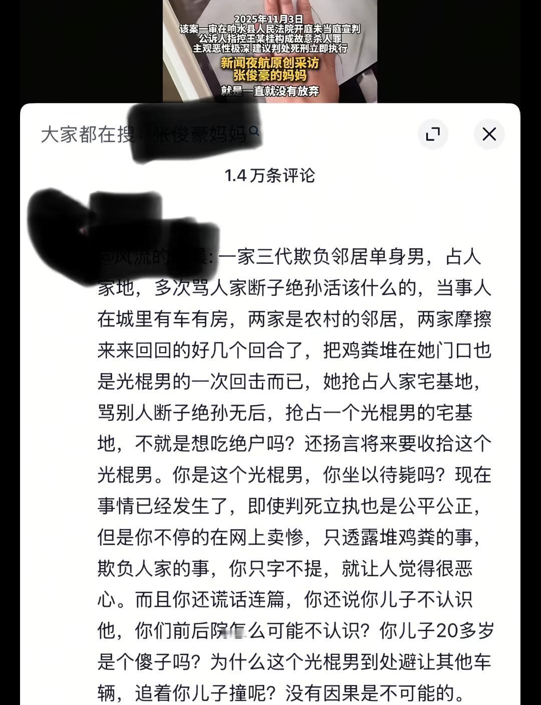 高三男生遇害案惊天反转,卖惨带货的母亲,藏了多少不堪真相? 高三男生张俊豪被邻居撞死一案,舆论彻底颠覆。起初,张母声泪俱下控诉嫌疑人毫无悔意,将自家塑造成“无冤无仇”的受害者。 其实两家积怨已久,正月初八的鸡粪争执只是导火索,真正的根源就是宅基地纠纷。在访问中张母却轻描淡写将侵占定义为“鸡毛蒜皮”,要知道在农村,宅基地就是光棍汉的立身之本。 更令人齿冷的是,张家被曝不仅图谋“吃绝户”,还在王某桂父亲出殡时故意捣乱,甚至肆意辱骂诅咒等。 如今张母一边在网上卖惨博取同情,一边悄然开启直播带货,对自家的恶行绝口不提。诚然,离世的孩子无辜,但受害者的身份,绝不等于占尽道理。 别让卖惨的滤镜掩盖了真相,这场由邻里积怨酿成的悲剧里,从来没有绝对的无辜者。真相 正义 纠纷