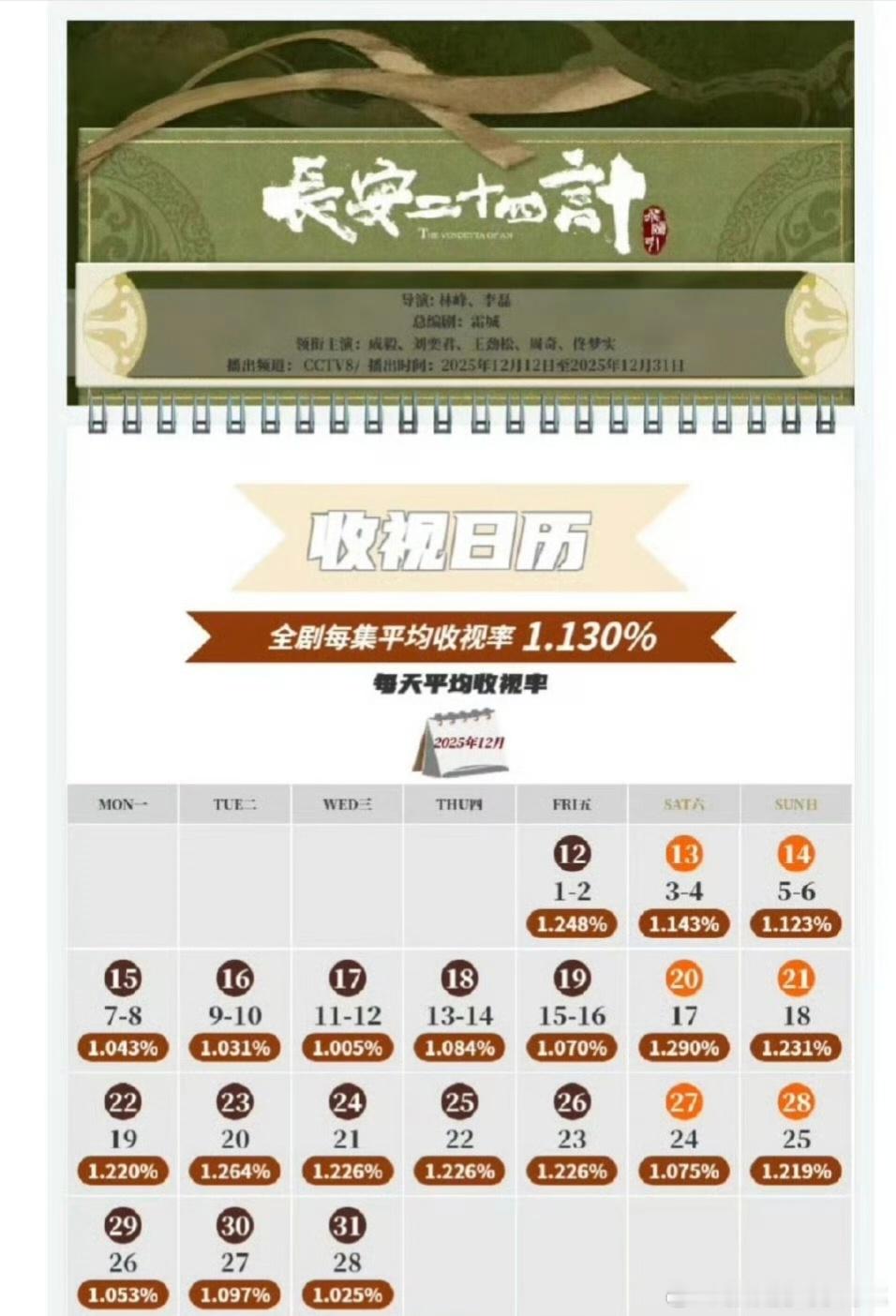 成毅领衔主演的《长安二十四计》CVB全剧每集平均收视率1.130%,这是每集都破1了啊,这部剧我也追了,值得这个耀眼的成绩!